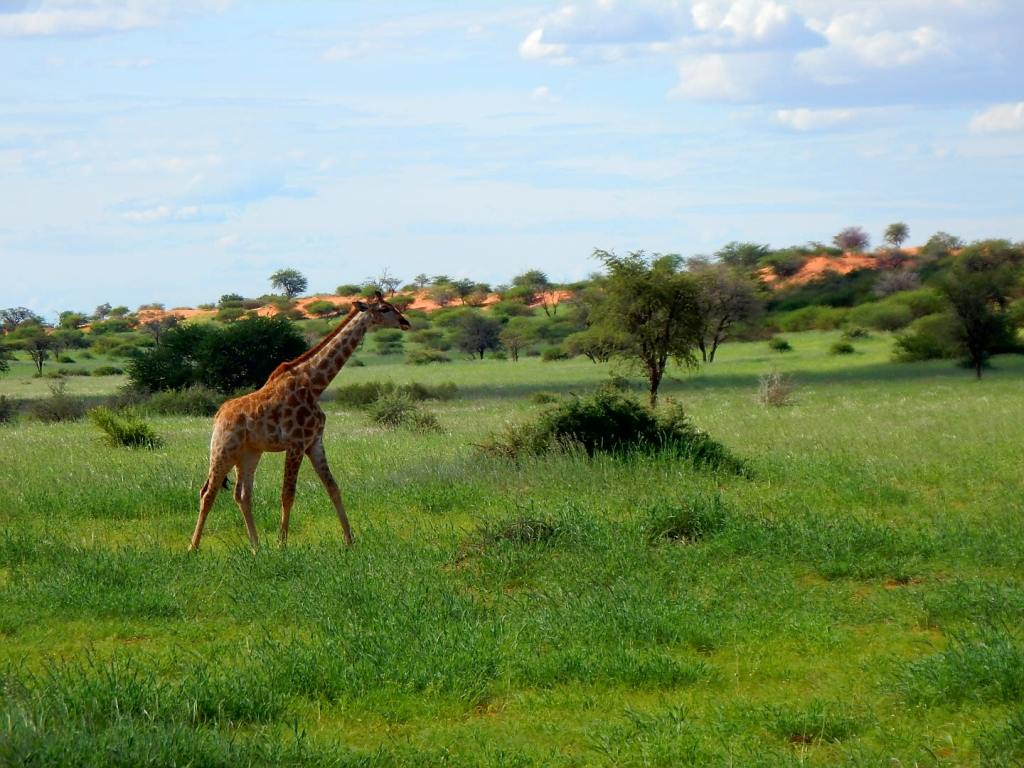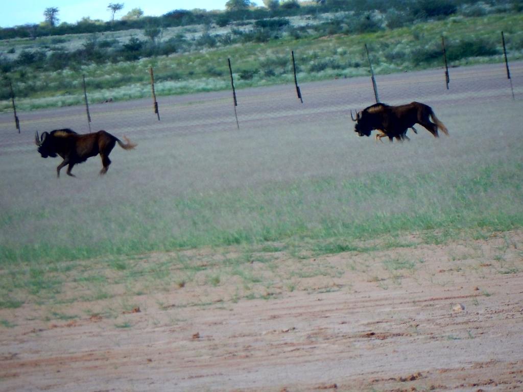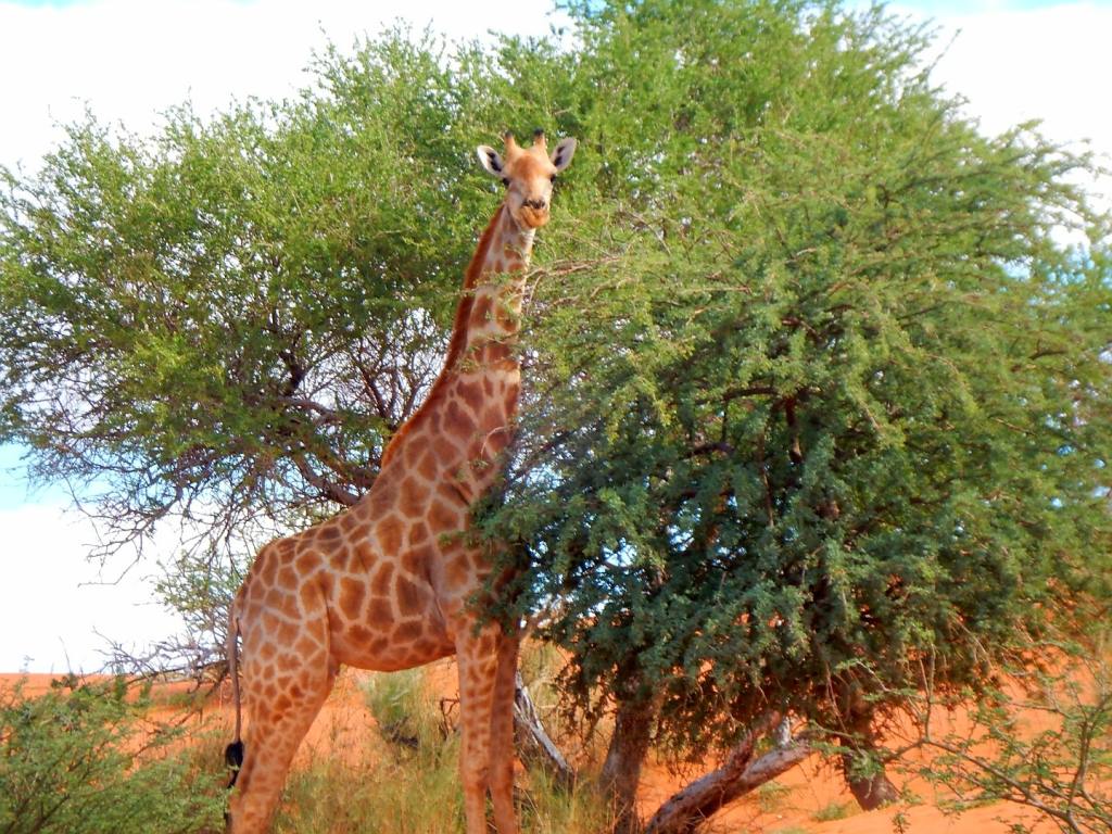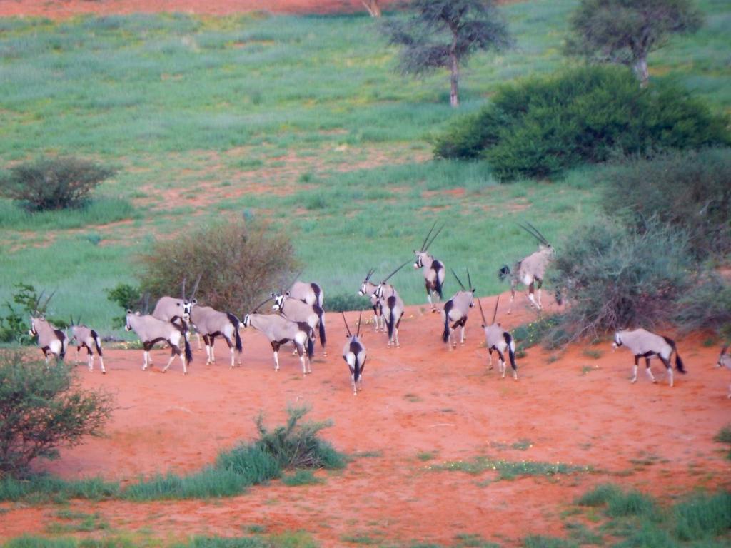 Zum Frühstück besucht uns eine Fuchsmanguste, sieht fast wie ein Erdmännchen aus. Dann fahren wir nach Mariental, da gibt’s nicht viel. Wir schauen uns die Kirche (leider nur von außen) an und kaufen was zum Abendessen und fürs morgige Frühstück. Dann wieder Pool – das ist Urlaub! Nachmittags starten wir zur Jeepsafari (da wir die einzigen Gäste sind, wieder sehr privat) durch die Kalahari, anschließend zur Gepardenfütterung und zum Abschluss noch ein paar Gin Tonics zum herrlichen Sonnenuntergang! Ein wirklich faszinierendes Abenteuer! Wir sehen wirklich jede Menge Tiere: Säbelantilopen, Springböcke, Giraffen, Gnus, Nashörner dazu noch eine riesige Herde Oryx und später zwei Zebras, aber die halten mal wieder nicht still! Dazu kommt noch das Abenteuer Jeep- es macht dem Fahrer richtig Spaß mit Speed die Dünen hoch zu fahren und dann etwas langsamer runter. Es ist fast wie bei einer Berg- und Talfahrt auf dem Rummel 😁! Wir staunen über die gewaltige Nester der Webervögel. Die Vögel selbst sind gar nicht so groß (etwa wie ein Spatz), aber sie leben in riesigen Kolonien mit bis zu 300 Vögel! Die Nester sind stark frequentiert, fast wie in einem Bienenstock! Es ist ein fast ein Wunder, dass wir diese tollen Farben bestaunen dürfen. Unser Guide bestätigt uns, dass es das erste Mal seit 8 bis 10 Jahren ist, dass die Kalahari so grün istt. Was haben wir doch für ein Glück 🤩! Die Lodge hat zur Zeit 6 Geparden, die hier aufgepäppelt werden, weil sie als Baby verlassen wurden. Wir dürfen zur Fütterung dabei sein. Wenn sie groß genug sind, werden sie wieder in die Freiheit entlassen. Was für tolle Eindrücke!
