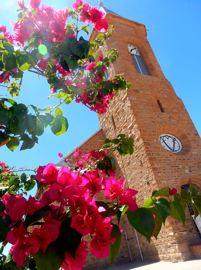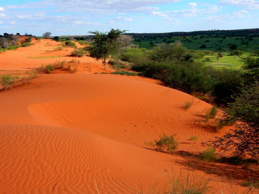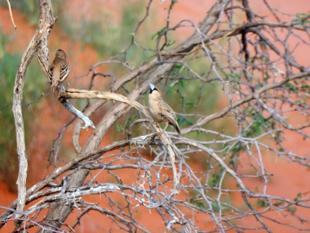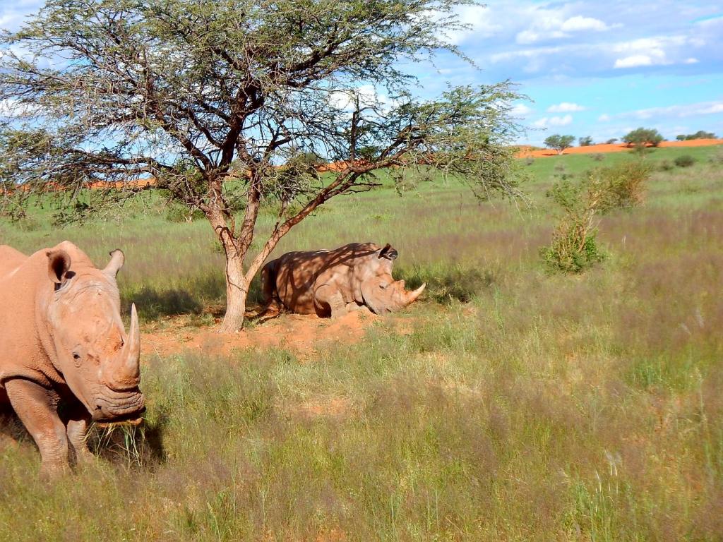 Zum Frühstück besucht uns eine Fuchsmanguste, sieht fast wie ein Erdmännchen aus. Dann fahren wir nach Mariental, da gibt’s nicht viel. Wir schauen uns die Kirche (leider nur von außen) an und kaufen was zum Abendessen und fürs morgige Frühstück. Dann wieder Pool – das ist Urlaub! Nachmittags starten wir zur Jeepsafari (da wir die einzigen Gäste sind, wieder sehr privat) durch die Kalahari, anschließend zur Gepardenfütterung und zum Abschluss noch ein paar Gin Tonics zum herrlichen Sonnenuntergang! Ein wirklich faszinierendes Abenteuer! Wir sehen wirklich jede Menge Tiere: Säbelantilopen, Springböcke, Giraffen, Gnus, Nashörner dazu noch eine riesige Herde Oryx und später zwei Zebras, aber die halten mal wieder nicht still! Dazu kommt noch das Abenteuer Jeep- es macht dem Fahrer richtig Spaß mit Speed die Dünen hoch zu fahren und dann etwas langsamer runter. Es ist fast wie bei einer Berg- und Talfahrt auf dem Rummel 😁! Wir staunen über die gewaltige Nester der Webervögel. Die Vögel selbst sind gar nicht so groß (etwa wie ein Spatz), aber sie leben in riesigen Kolonien mit bis zu 300 Vögel! Die Nester sind stark frequentiert, fast wie in einem Bienenstock! Es ist ein fast ein Wunder, dass wir diese tollen Farben bestaunen dürfen. Unser Guide bestätigt uns, dass es das erste Mal seit 8 bis 10 Jahren ist, dass die Kalahari so grün istt. Was haben wir doch für ein Glück 🤩! Die Lodge hat zur Zeit 6 Geparden, die hier aufgepäppelt werden, weil sie als Baby verlassen wurden. Wir dürfen zur Fütterung dabei sein. Wenn sie groß genug sind, werden sie wieder in die Freiheit entlassen. Was für tolle Eindrücke!