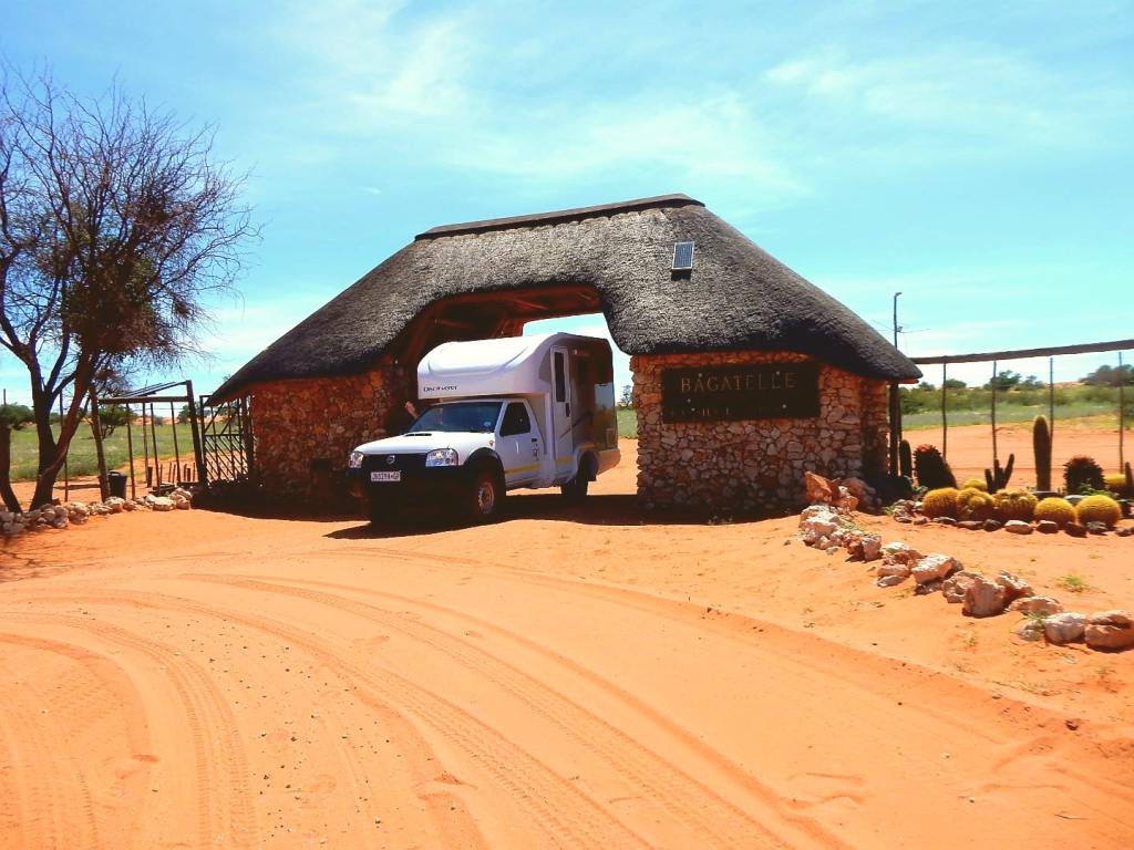 Wir bestellen das Menü für 20 € pro Person zum Abendbrot und fahren zu unserem Camping-Stellplatz. Hier ist alles sehr weitläufig und die nächsten Nachbarn sind vielleicht 300 m weit weg. Der Stellplatz hat ein Sanitärhäuschen mit Toilette, Dusche und Waschbecken. Sehr geräumig und es gibt auch richtig viel Wasserdruck, ein tolles Gefühl mitten in der Wüste. Stille rundherum. Zum Abendessen laufen wir zum Restaurant- ca. 20 Minuten und sehen einem tollen Sonnenuntergang. Das Abendessen ist sehr romantisch mit Feuerschale und unter einem Reetdach im Freien angerichtet. Es gibt mehrere Gänge, alles schmeckt wirklich ausgezeichnet und es sind diesmal auch vernünftige Portionen. Durch die Lichter der romantischen Stimmung werden unzählige Insekten angelockt. Sie schwirren um einen herum, fallen unmotiviert auf den Tisch und landen auch manchmal auf dem Teller. Aber – und da verstehe ich keinen Spaß- auch immer wieder auf mir, in meinen Haaren, im Ausschnitt meines T-Shirts und welche krabbeln mir sogar von unten in die Hose! Ich schlage wie eine Verückte um mich und sehne jeden Gang schleunigst herbei! Das liegt aber ganz bestimmt nicht im Blut der Afrikaner … und wahrscheinlich amüsieren sie sich prächtig darüber, wie die Deutsche mit den Insektenattacken kämpft. Ich will morgen auf keinen Fall nochmal ein romantisches Diner im Freien! Endlich kommt der letzte Gang, das Dessert ist köstlich – die Insekten schrecklich! Wir laufen mit unseren Stirnlampen in der Dunkelheit zurück und sind vom Sternenhimmel über der Wüste fasziniert. Die Milchstraße und auch das Kreuz des Südens wecken Erinnerungen an Australien … wir geraten ins Schwärmen und die Attacken sind vergessen !