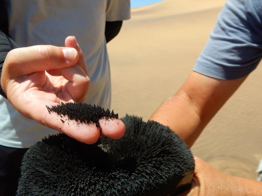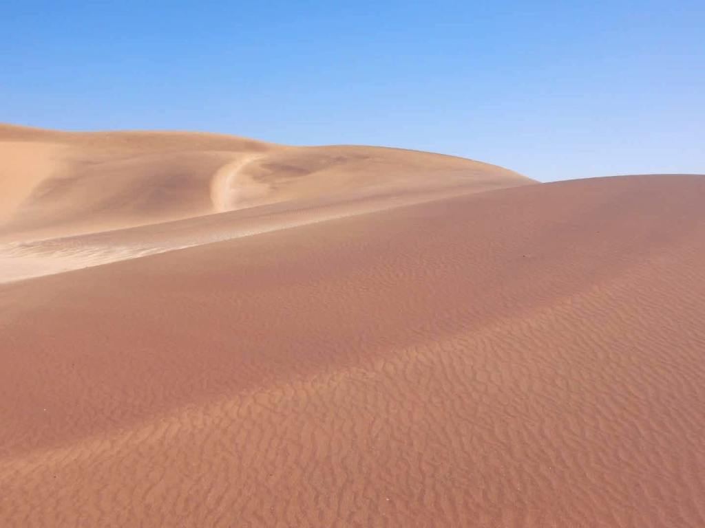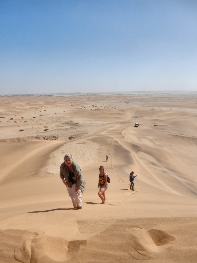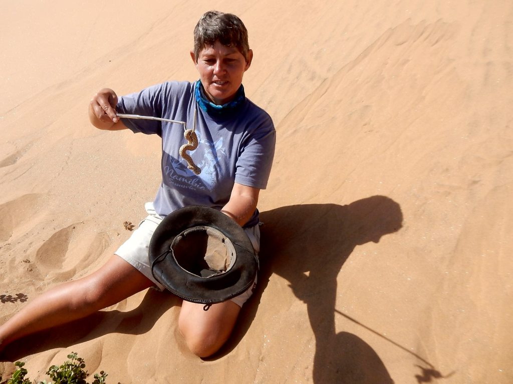 Auf zahlreiche Empfehlungen buchen wir die „living dessert“ -Tour zu den Little Fives. Analog zu den Big Five (Elefant, Löwe, Leopard, Nashorn und Büffel) gibt es diese spezielle Wüstentour zu den ganz kleinen – sehr interessanten Tierchen der Wüste. Wir versuchen eine Trichterspinne, einen Palmatogecko, eine Sandviper, eine Schaufelschnauzenechse und das Namaqua-Chamäleon zu finden. Wir werden früh um 8 Uhr von Chantal, unserem Tour-Guide abgeholt. Der Tag startet sonnig und nicht neblig, wie so oft in Swakopmund. Wir haben Glück 😀! Am Anfang erklärt sie uns sehr ausführlich, dass wenn sie Kreise in den Sand zeichnet, wir da bitte nicht reinlatschen sollen und überhaupt wäre es besser, wenn wir im Gänsemarsch laufen, um die kleinen Tierchen nicht zu zertreten. Sie erklärt uns weiter, dass die Trichterspinne sich bis zu 60 cm in den Sand eingräbt. Dann malt sie gleich zwei Kreise und im ersten findet sie einen winzigkleinen Klopfkäfer. Da ist selbst ein Streichholzkopf riesig dagegen. Im zweiten Kreis ist eigentlich nur ein kleines Loch zu sehen. Sie fängt an zu buddeln und legt die ersten 4 cm des Trichters einer Trichterspinne frei. Gebilde aud Sand und Seide – so stabil, dass die Spinne darin wohnen kann. Beachtlich. Die Spinne selbst, sehen wir nicht, die wohnt ja da unten. Als nächstes hüpft sie aus dem Auto und buddelt und freut sich, weil sie was zwischen ihren Händen versteckt hält und meint wir sollen mal alle aussteigen – sie sucht den Schatten und präsentiert uns einen Palmatogecko. Der ist eigentlich nachtaktiv und deshalb sehr lichtempfindlich. Wir machen unsere Fotos und staunen, wie schnell er sich wieder selbst eingräbt. Da wird auch uns klar, wie wichtig es ist, den Sand nicht durch unsere Schritte unnötig zu verdichten, weil dann der kleine Kerl und all seine Verwandten unter dem Sand ersticken. Der Gänsemarsch muss nicht weiter erwähnt werden, wir achten extrem auf unsere Schritte. Wir treffen fast alle little 5 – nur kein Chamäleon, aber wir sind deshalb nicht traurig. Es gibt soviel, was wir in kurzer Zeit über die Wüste und ihre winzigen Bewohner lernen, dass die Zeit wie im Flug vergeht. Unheimlich Spaß macht es auch die Dünen rauf und runter zu cruisen – ein tolles Erlebnis. Wir steigen sogar nochmal eine Düne hoch und rutschen neben einander wieder runter – das ergibt ein lautes Brummgeräusch – funktioniert nur bei Brummdünen 😀- der Sand muss luftig und locker sein, damit die Geräusche entstehen können. Wirklich ein tolles Erlebnis und absolut empfehlenswert!