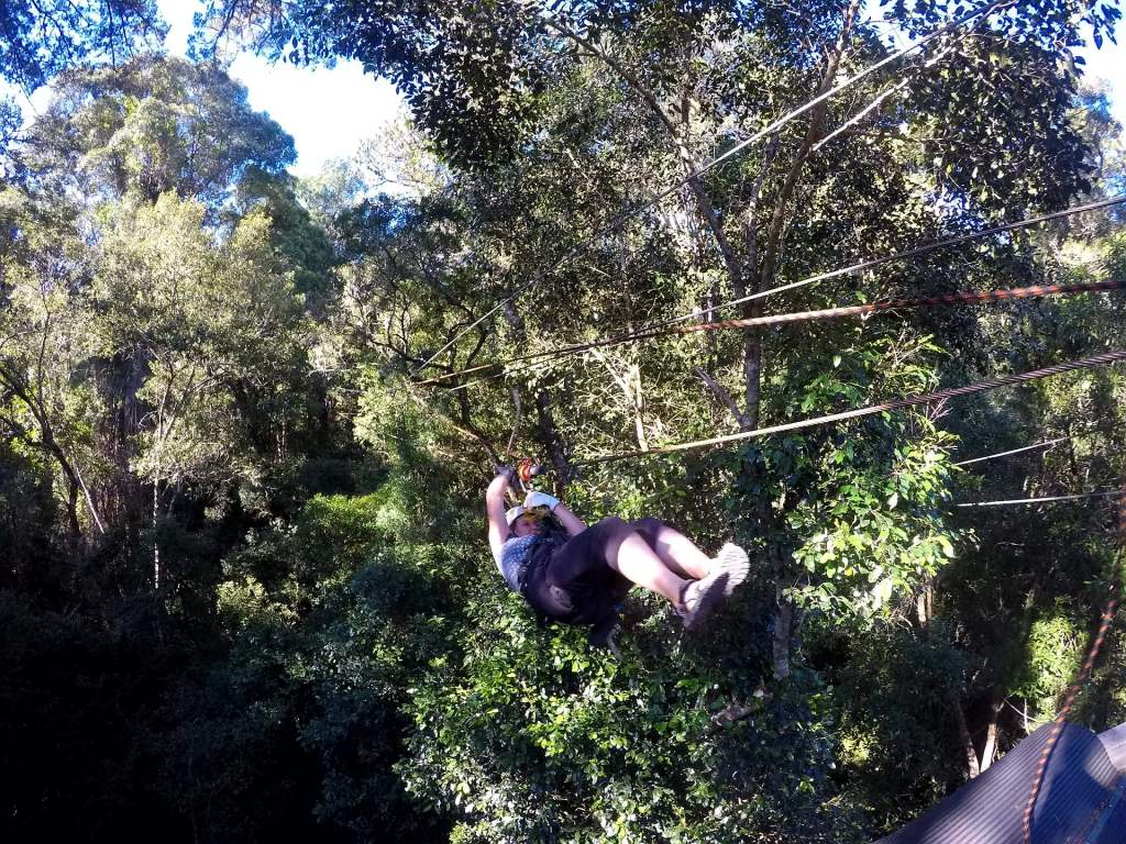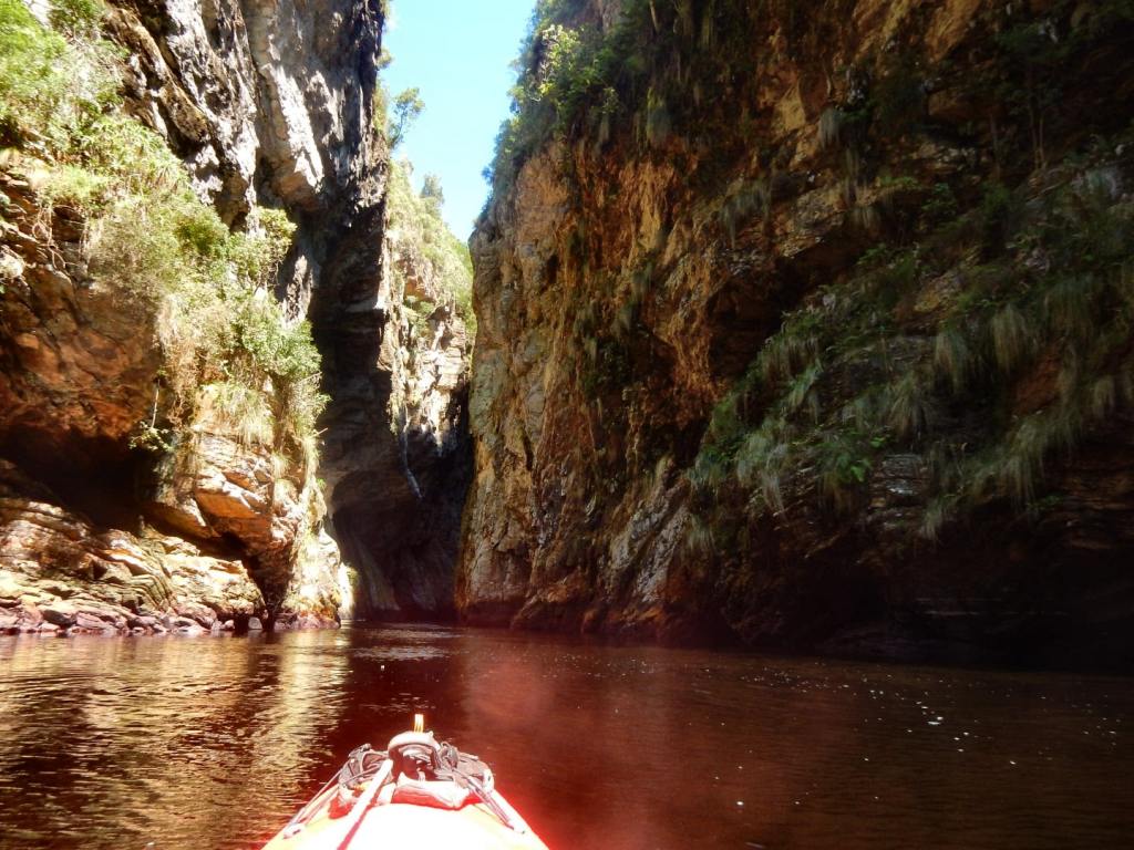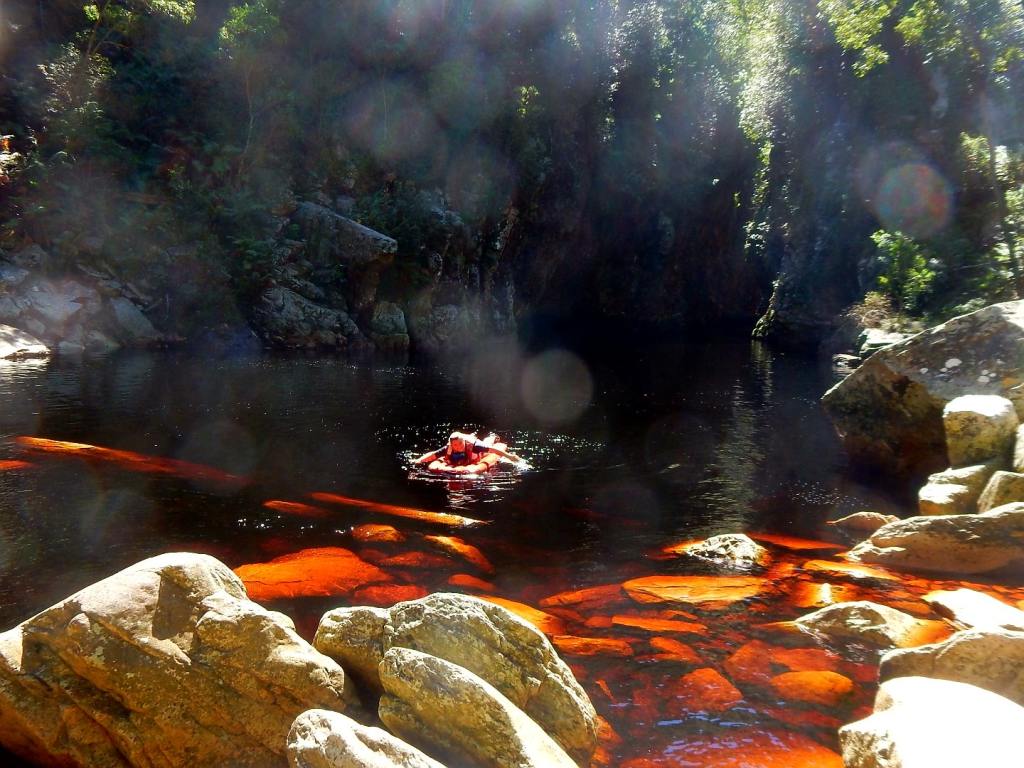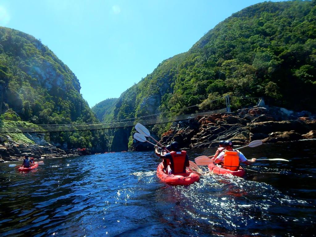 Mittendrin in der Garden Route befindet sich ca. 100 km von Knysna der Tsitsikamma Nationalpark (kurz Tsitsi) mit einem der letzten Urwälder Südafrikas. Bekannt für seine tollen Wanderwege – wie den berühmten Ottertrail, für den man allerdings 5 Tage braucht. Nach Wandern ist uns heute nicht, wir haben eine Paddeltour entlang des Storms River, der hier ins Meer mündet, gebucht. Zuerst geht’s ein wenig übers Meer, ein paar sanfte Wellen – das ist nicht wirklich schwierig, weil das Boot aus Vollplaste ist, kleine Löcher im Boden hat, damit es nicht vollläuft und wir zum Überleben mit Schwimmwesten und Helmen bestens ausgestattet wurden. Dann unter der bekannten Hängebrücke durch – in den Fluss rein. Das Wasser ist ziemlich braun – der Guide erklärt, dass das vom Teein aus den Roibusch-Pflanzen kommt, die hier überall an den Hängen wachsen. Die Felswände sind bis zu 80 m hoch und es ist sehr imposant. Das Wetter spielt auch mit und wir paddeln bis zu einer Stelle, wo wir aus den Booten auf große Plastikmatratzen (Lilo genannt) umsteigen. Von hier geht’s bäuchlings liegend weiter und wir paddeln mit unseren Händen. Einige Mutige klettern auf die Felsen und üben sich im Klippenspringen – uns reicht das Zuschauen. Dann geht’s wieder zurück. Wirklich ein tolles Erlebnis- zum Schluss gehen wir noch eine Runde im Indischen Ozean baden, das Wasser hat angenehme Temperaturen. Als nächstes steht Zip-Lining, was die hier Canopy-Tour nennen, auf unserem Aktivityprogramm. Wir fahren 20 Minuten mit dem Auto und da kommt doch so ein kleines Hüngerchen … wir stoppen an einem amerikanischen Diner, der uns von unserem Lodgebesitzer wärmstens empfohlen wurde. Tolles Ambiente und schöne 60er Jahre Musik. Der Cheeseburger schmeckt richtig lecker, schade nur, dass wir keine Zeit haben, weil die Canopy-Tour startet. Wir sind mal wieder die einzigen beiden und genießen die Privattour. Nach Sicherheits- und Corona-Einweisung fahren wir wieder zurück zumTsitsi und hängen uns in die Seile 😁 . Wow, das macht richtig Spaß. Ein Guide vorneweg und eine(r) nach uns. Die beiden kümmern sich ums Ein- und Aushaken und wir haben den puren Spaß: über die Bäume des Urwaldes zu sausen und die herrlichen Ausblicke zu genießen😃. Einmal verklemmt sich mein Handschuh und der Guide kommt am Seil langgehangelt und holt mich ab, weil ich zwischen den Plattformen hänge. Aber ich fühle mich total sicher und so ist es eher lustig als dramatisch. WAS für ein toller TAG! Wieso kriegen wir beide das Grinsen nicht mehr aus dem Gesicht? 😎😁
