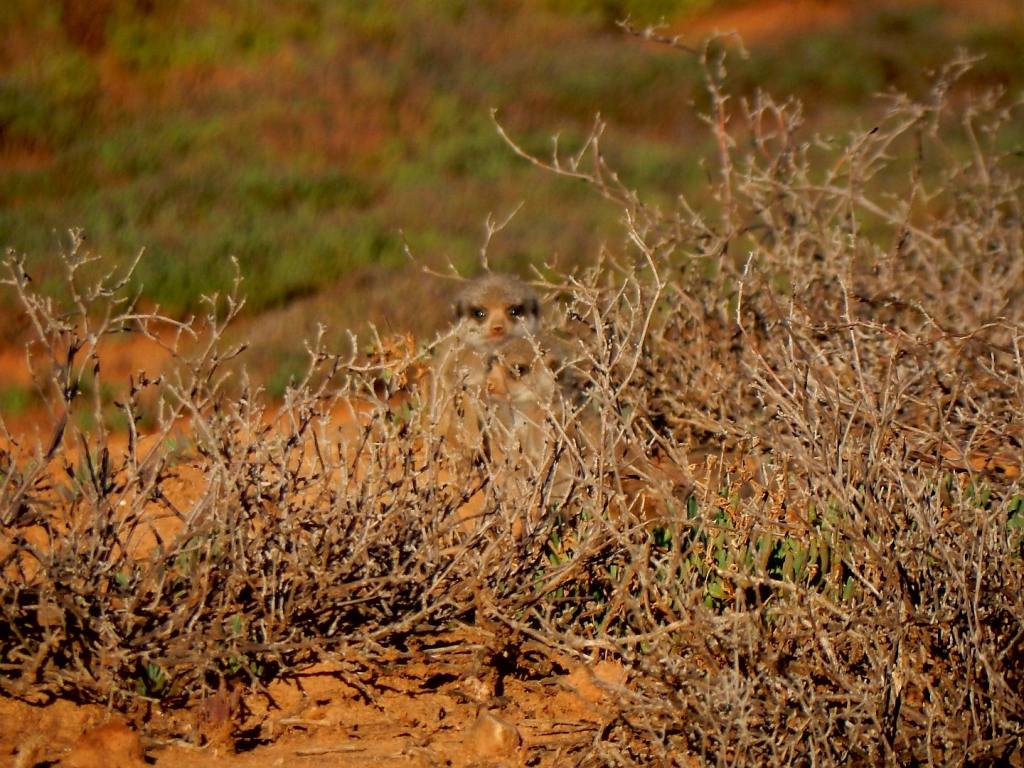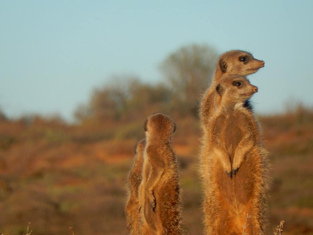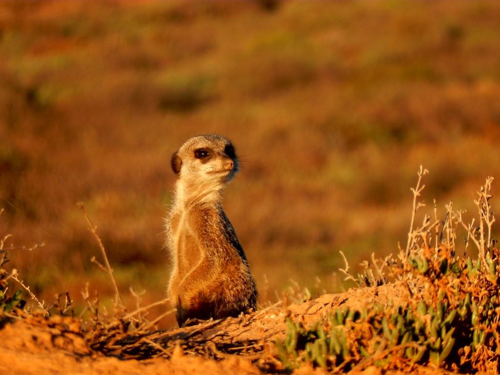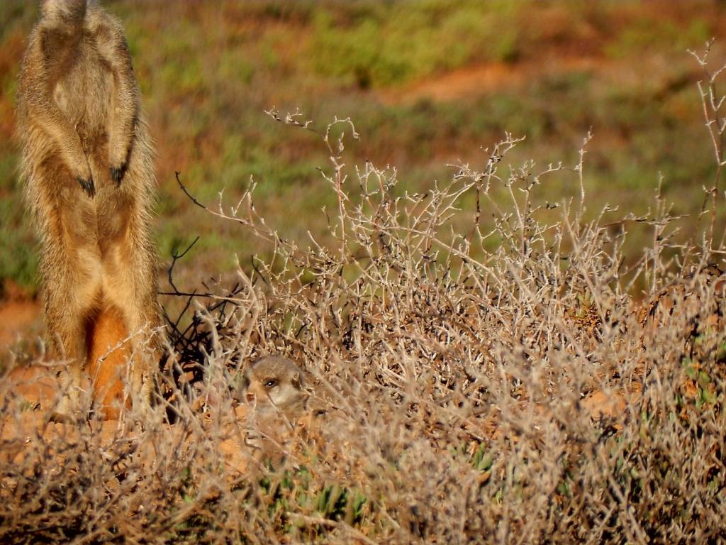 Als wir in unserer Lodge bei Oudtshoorn ankommen, ist es noch früh und wir schauen uns die Stadt an. Es ist wenig vom Glanz alter Zeiten übrig – hier wurden die Leute durch Straußenfarmen reich, als es voll in Mode war, Straußenfedern zu tragen. Aber wir würden gern einen Kaffee trinken und finden eine Waffelbäckerei und so entscheiden wir uns schnell um und wählen Milchshakes und eine belgische Waffel … Oh das war ein Genuß … da könnte ich immer noch von schwärmen 😏. Aber wir sind nicht nach Oudtshoorn gefahren um Straußenfarmen zu sehen oder die viel angepriesene Cango Caves zu besuchen – Tropfsteinhöhlen gibts ja bei uns auch! Wir wollen eine Erdmännchentour machen. Und – ihr kennt das ja schon – die startet zeitig 😝 … wir müssen mal wieder um sechs raus! Die Sonne geht gerade auf als wir unseren Guide treffen – ein alter Ranger mit richtig viel Erfahrung! Wir werden mit Campingstühlen ausgestattet und setzen uns direkt vor eins der 25 verschiedenen auf dem Gelände verteilten Höhlensysteme einer Erdmännchenfamilie. Und es dauert auch nicht lang bis das erste Erdmännchen raus kommt, um sich den Bauch in der Sonne zu wärmen. Wir sind keine Störenfriede, und können uns ganz normal unterhalten. Es ist wirklich putzig zu sehen, wie sie das machen. Der Guide erklärt uns, dass man das Gesicht des Erdmännchens verschatten kann und da passiert nichts … aber nicht den Bauch! Er demonstriert es auch gleich und wirklich … beim Gesicht passiert nix aber beim Bauch sucht sich der kleine Kerl eine neue Position 😀. Und dann schauen wir zu, wie die ganze Familie wach wird und sich die Bäuche wärmt und zum Schluss haben wir sogar das unheimliche Glück, ganz kleine Babys zu sehen – sie wurden vor 3 Wochen geboren!