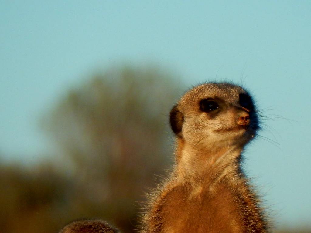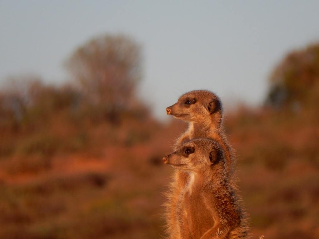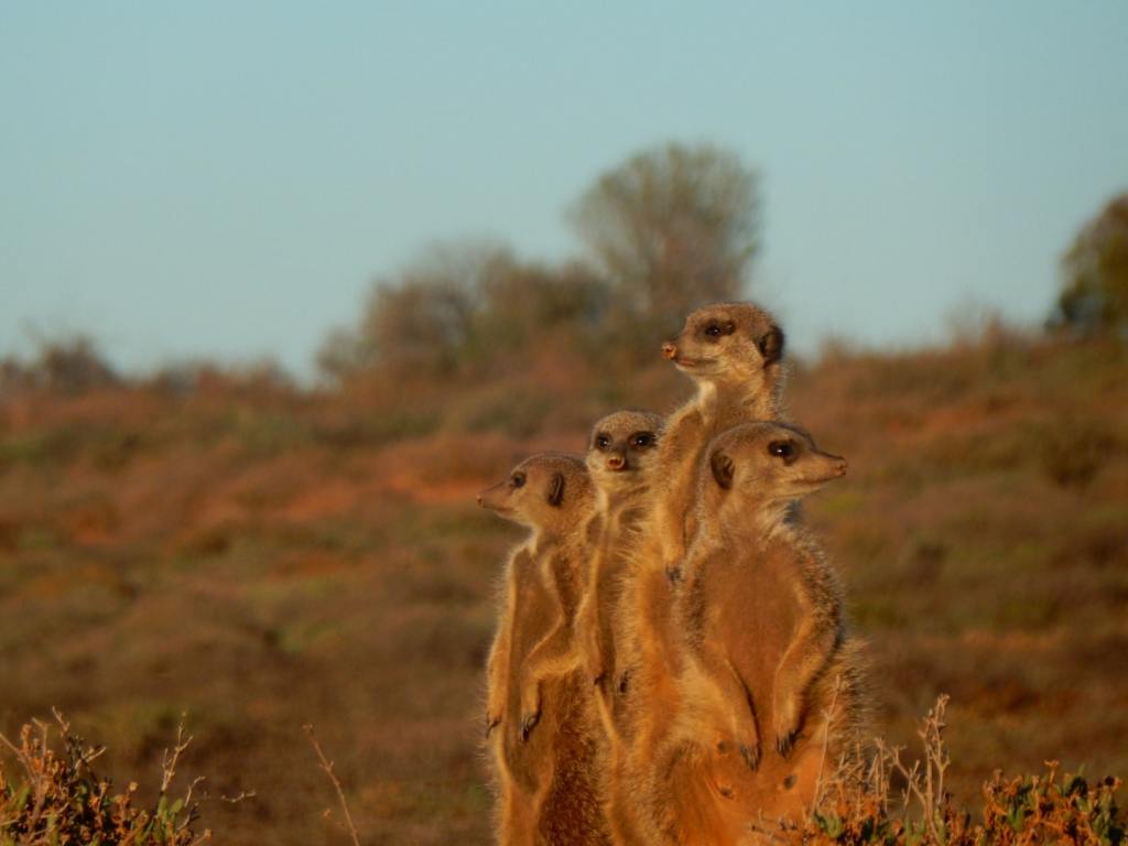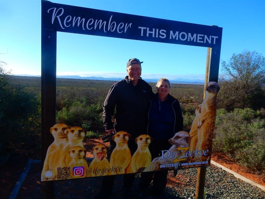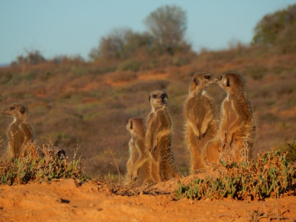 Als wir in unserer Lodge bei Oudtshoorn ankommen, ist es noch früh und wir schauen uns die Stadt an. Es ist wenig vom Glanz alter Zeiten übrig – hier wurden die Leute durch Straußenfarmen reich, als es voll in Mode war, Straußenfedern zu tragen. Aber wir würden gern einen Kaffee trinken und finden eine Waffelbäckerei und so entscheiden wir uns schnell um und wählen Milchshakes und eine belgische Waffel … Oh das war ein Genuß … da könnte ich immer noch von schwärmen 😏. Aber wir sind nicht nach Oudtshoorn gefahren um Straußenfarmen zu sehen oder die viel angepriesene Cango Caves zu besuchen – Tropfsteinhöhlen gibts ja bei uns auch! Wir wollen eine Erdmännchentour machen. Und – ihr kennt das ja schon – die startet zeitig 😝 … wir müssen mal wieder um sechs raus! Die Sonne geht gerade auf als wir unseren Guide treffen – ein alter Ranger mit richtig viel Erfahrung! Wir werden mit Campingstühlen ausgestattet und setzen uns direkt vor eins der 25 verschiedenen auf dem Gelände verteilten Höhlensysteme einer Erdmännchenfamilie. Und es dauert auch nicht lang bis das erste Erdmännchen raus kommt, um sich den Bauch in der Sonne zu wärmen. Wir sind keine Störenfriede, und können uns ganz normal unterhalten. Es ist wirklich putzig zu sehen, wie sie das machen. Der Guide erklärt uns, dass man das Gesicht des Erdmännchens verschatten kann und da passiert nichts … aber nicht den Bauch! Er demonstriert es auch gleich und wirklich … beim Gesicht passiert nix aber beim Bauch sucht sich der kleine Kerl eine neue Position 😀. Und dann schauen wir zu, wie die ganze Familie wach wird und sich die Bäuche wärmt und zum Schluss haben wir sogar das unheimliche Glück, ganz kleine Babys zu sehen – sie wurden vor 3 Wochen geboren!