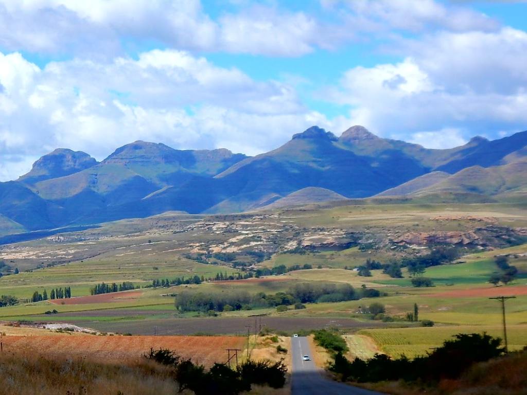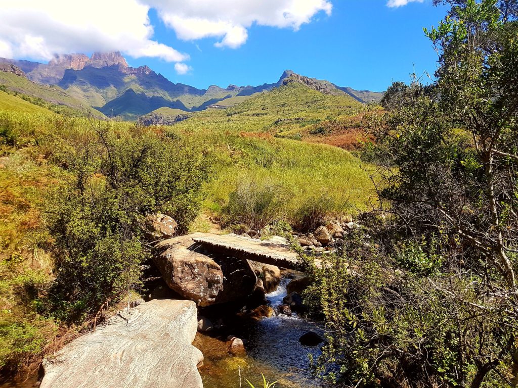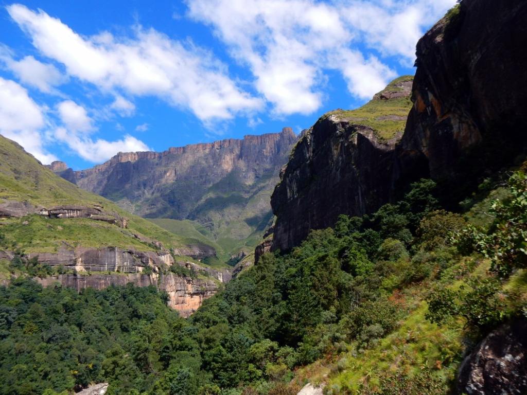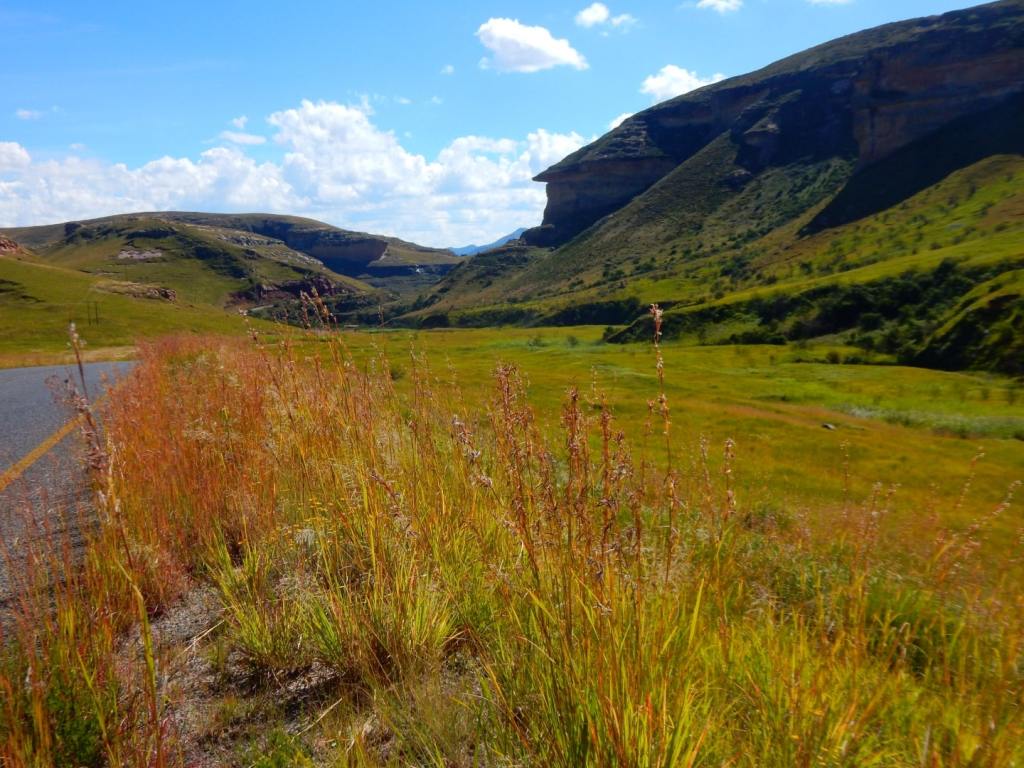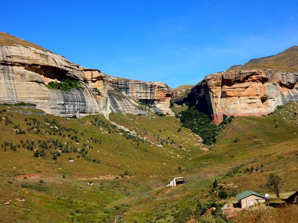 Wir verbringen das diesjährige Osterfest in den Drachensbergen (in engl. Drakensberge). Man unterscheidet die nördlichen und die südlichen, beide liegen südlicher als die Panoramaroue, obwohl die auch zu den Drachensbergen zählt … etwas verwirrend für mich, aber so ist es nunmal. Unser Ziel sind die nördlichen Drachensberge – im Grenzgebiet zum Königreich Lesotho. Wir haben viel gelesen über die außergewöhnliche Schönheit der zerklüfteten Bergwelt der Drakensberge, die man auch das „Dach Südafrikas“ nennt. Senkrechte Felswände, tosende Wasserfälle, grasbedeckte Berghänge … na wie klingt das für euch? Die Anreise vom Krüger NP ist für uns zu lang und so schlafen wir eine Nacht in Nirgendwo – genannt Ermelo. Das merk ich mir mit der Pomelo 🍈, sonst hätte ich den Namen schon gleich wieder vergessen🤣🤣. Dann fahren wir für 3 Nächte nach Bethlehem- sehr passend für Ostern … noch passender wäre es für Weihnachten, aber da wollen wir ja schon wieder zu Hause sein😉! Die Anreise ist schon sehr beeindruckend – wir fahren durch den Golden Gate Highlands Nationalpark. Ein tolles Fleckchen Erde! Der Ort Bethlehem selbst ist eher trostlos und so fahren wir ins nicht weit entfernte Clarens. Das gilt hier als touristisches Juwel und ist für seine zahlreichen Künstler und deren Galerien bekannt. Und es ist wirklich ein ganz bezaubernder kleiner Ort – wir schlendern durch die Gassen und schauen uns die Bildergalerien und einige der zahlreichen kleinen Läden, die selbstgemachte Produkte oder irgendwelchen Krimskrams verkaufen an und schlürfen einen Cappuccino in einem tollen Café. Es ist schön dem bunten Treiben zuzuschauen und Leute gibts hier reichlich – den Einheimischen gefällt es hier anscheindend auch sehr gut. Dann sind wir rum und der Tag ist noch lang, also fahren wir nochmals durch den Golden Gate Park und genießen die tollen Aussichten. Am Nachmittag fahren wir zur höchst gelegenen Lodge in Südafrika in 2200 m Höhe. Leider hängen die Wolken sehr tief und das erwartete Panorama können wir nicht sehen. Ich schlage eine kleine Wanderrunde vor, aber Volker ist missmutig und will zurück. Also drehen wir nach 20 Minuten wieder um und gehen zurück zum Auto. Den Ostersonntag haben wir uns für die Wanderung zum sogenannten Amphitheater im Royal Natal NP reserviert. Der liegt allerdings 2 Autostunden von Bethlehem entfernt. Die Sonne lacht, keine Wolken und wir können die Aussicht auf diese fast 5 km lange steil abfallende 500 m hohe Felswand genießen. Sie sieht mächtig gewaltig aus und wird an den beiden Seiten von jeweils über 3000m hohen Bergen begrenzt. Wir wandern durch die Schlucht, aber so richtig nah kommen wir nicht ran. Eigentlich wollten wir einen Blick auf den Tugela-Wasserfall erhaschen, der hier in mehreren Stufen insgesamt 947 m in die Tiefe stürzt – der zweithöchste der Welt. Leider sehen wir ihn nicht und so drehen wir nach 2 Stunden wieder um und kehren zum Auto zurück … beide sind wir richtig knülle – das war anstrengender als gedacht😩.
