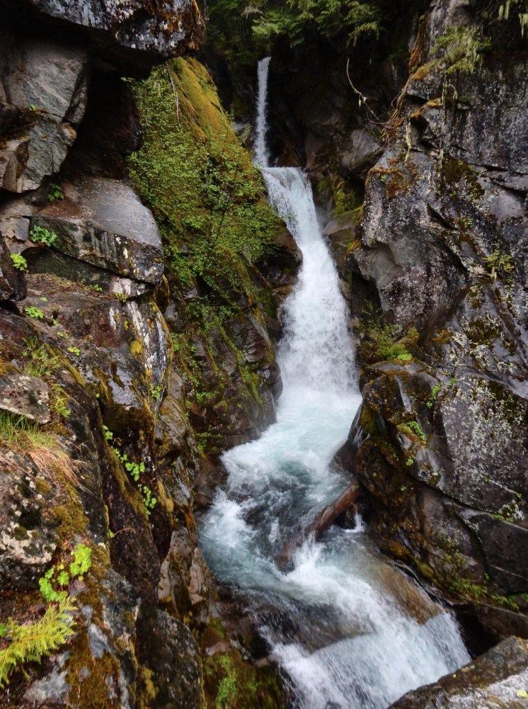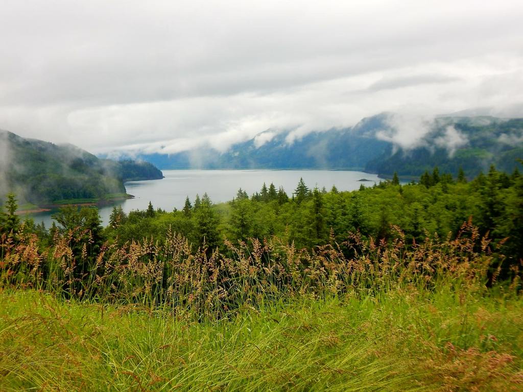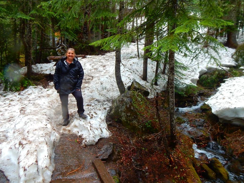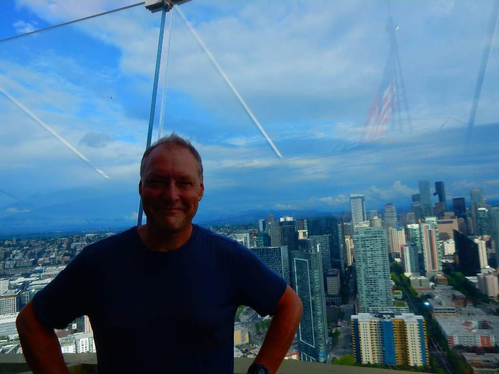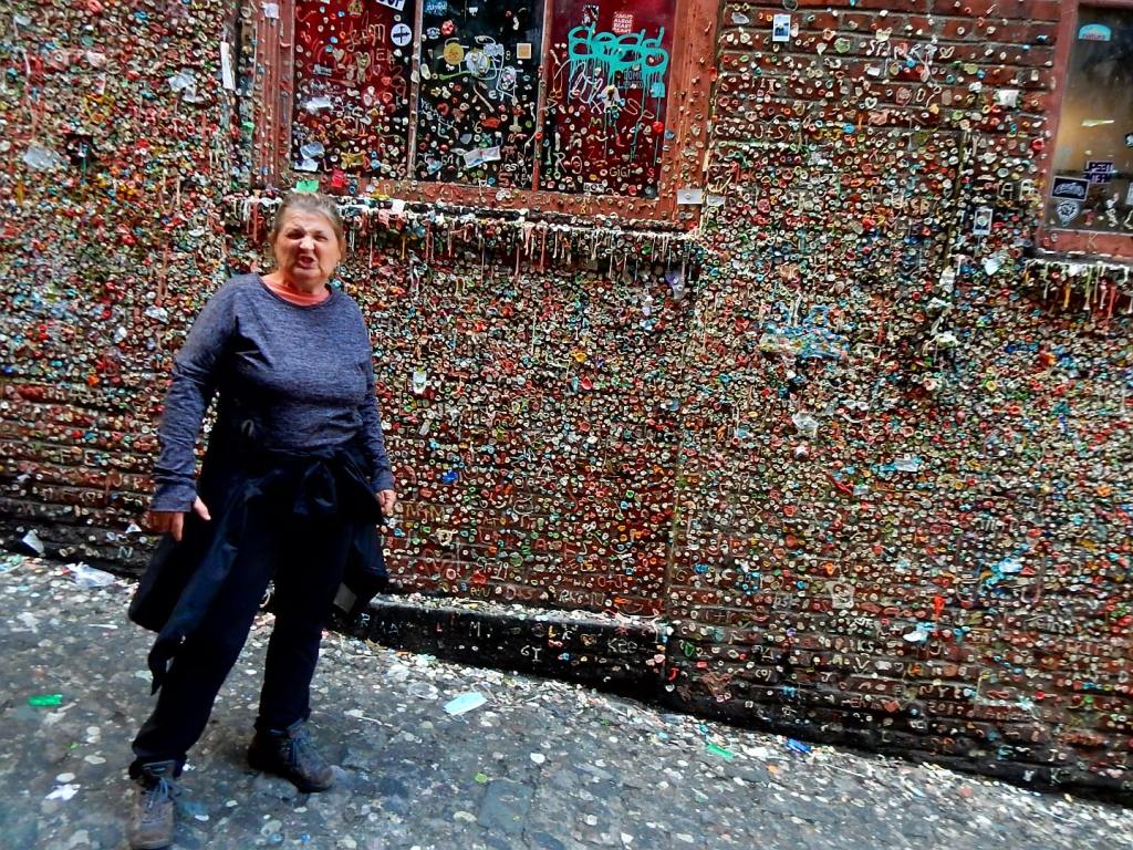 Am nächsten Tag regnet es immer noch … neee, neee – so ham ‚mer nicht gewettet 😠. Nützt nichts, wir verlassen Portland weiter in Richtung Seattle – immer in der Hoffnung, dass der Regen aufhört und uns die Möglichkeit gibt, die umliegenden Berge zu sehen. Wir fahren extra in den Nationalpark Mt. Rainier – ein 4300 m hoher Berg mit vielen Gletschern! Aber es ist nichts zu wollen, die Wolken hängen zwar tief aber wir kommen nicht über die Wolkendecke drüber … zumindest nicht mit dem Auto (Flieger würde gehen🤣). Dann gibts eben keine schönen Bergfotos, sondern jede Menge Wasserfall-Fotos! So, die kann man auch bei Regen knipsen und bei einem müssen wir sogar ein wenig wandern … über Schnee! Mann ist das hier kalt 7 Grad! und schweineglatt. Ich klammere mich sicherheitshalber an Volker fest, nicht dass ich noch hinfalle! Wer hätte das gedacht, dass hier im Juni noch meterhoch der Schnee liegt! Aber so hab ich auch noch etwas Winterfeeling in diesem Jahr … hatte ich bisher ja noch nicht! Plötzlich läuft ein liebestrunkener Auerhahn auf die Straße und dann weiter übern Schnee … immer hinter seiner Dame des Herzens her … witzig der arme Kerl in voller Balzstellung und? Oh nein! Sie verschmäht ihn – also auch noch völlig für umsonst – da kommt dann doch ein wenig Mitleid auf! Jetzt geht’s für uns aber weiter nach Seattle und ? … es hört endlich auf zu regnen 😎. ENDLICH! Ich mache gleich mal etwas Stress und hetzte Volker zur Space Needle – dem Wahrzeichen von Seattle. Man weiß ja nicht, ob es am nächsten Tag vielleicht doch wieder regnet. Und weil ich so aufgeregt bin, sag ich statt Space Needle (spricht man Späs Niedel)- Spies Nädel. Das freut Volker so, dass er mich immer wieder damit aufzieht. Und wenn ich es dann richtig sage, verbessert er mich auf Spies Nädel 🤣, das gefällt ihm deutlich besser! Wir können von da oben wunderbar auf Seattle schauen, allerdings ist der Mt. Rainier immer noch hinter den Wolken versteckt. Abends bummeln wir noch zur ekligsten Sehenwürdigkeit – ever! Eine Wand voller angekatschter Kaugummis – ähhh da wird einem richtig schlecht! Da es auch am nächsten Tag nicht regnet, können wir uns in Ruhe die Stadt anschauen und finden sie beide richtig schön! Wir schlendern auch über den berühmten Pike Place Market mit seinen tollen Fisch-, Blumen- und Obstständen und kaufen mal wieder leckere Sachen beim Bäcker ein! Setzen uns in ein Café, besuchen Souvenierläden und wir haben sogar noch die Zeit ins Museum of Pop Culture (MoPOP) zu gehen. Der Eintrittspreis von über 30 Dollar lohnt sich für mich nicht wirklich, denn die Musiklegenden der Stadt wie Jimi Hendrix, Nirvana und Pearl Jam sind nicht so meine Welt. Und ob sich die Genannten als Popmusiker bezeichnen würden, mag ich mal zu bezweifeln 🤔. Wir fahren sogar noch an die Westseite des Lake Union, wo das Hausboot von Tom Hanks in „Schlaflos in Seattle“ lag. Da liegen immer noch solche Häuser im See, allerdings nicht mehr das aus dem Film.