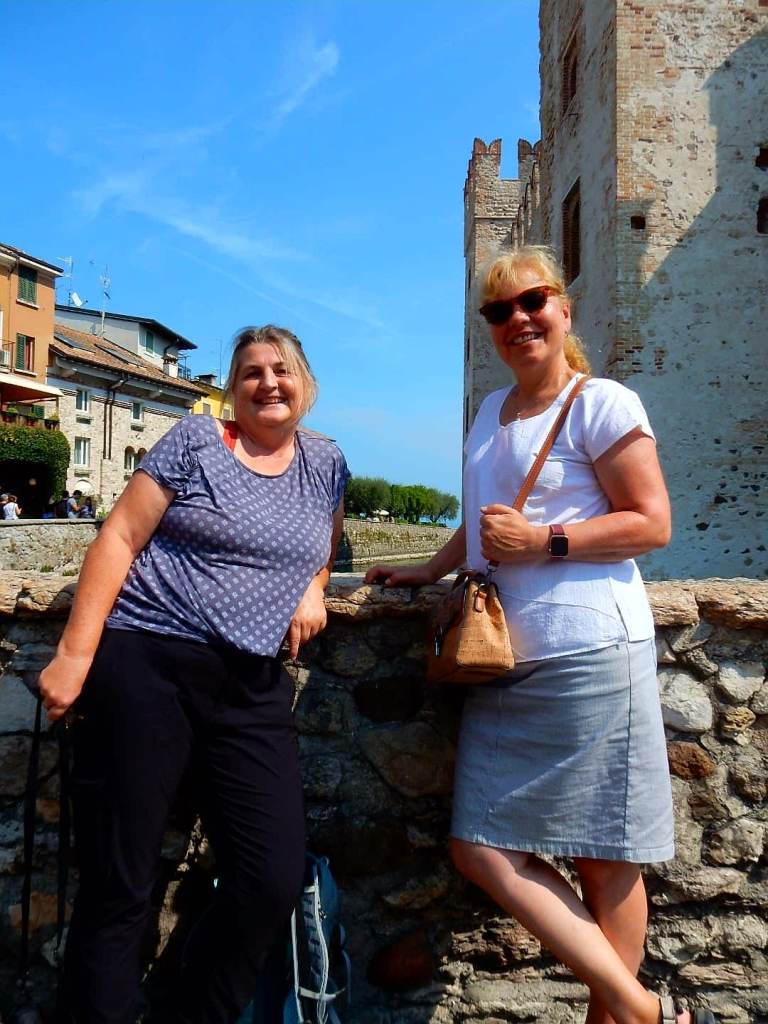 Nach meinem Kurzstopp in Südtirol geht’s weiter gen Süden … und wie es der Zufall will, sind auch Rolf und Ramona gerade in Italien unterwegs. Kurze Whatsapp hin und her und schon sind wir verabredet … also noch ein Stopp – diesmal am Gardasee. Ich versuche im gleichen Hotel wie die beiden einzuchecken, leider ist es komplett ausgebucht … da tue ich mal ganz überrascht und frage nochmal ganz erstaunt, ob denn so gar kein Zimmerchen für mich frei ist … wenigstens für eine Nacht? Dicker Schmollmund 💋! Es funktioniert … die Dame an der Rezeption erbarmt sich meiner und telefoniert mit dem Partnerhotel, wo sie mir gleich ein Zimmer für die nächsten drei Nächte reserviert (preislich auch weit unter booking-Preisen). Das Hotel liegt zwar nicht direkt am See, hat aber einen Pool (ziemlich kalt 😨) und ist nur 6 Min. mit dem Auto weg. Und so verbringen wir zwei entspannte Tage gemeinsam: leckeres Essen und süffiger Wein, ganz viel quatschen, ein wenig wandern – auch auf den Rocca di Manerba (ein Ausflugsfelsen am südlichen Gardasee) und Rolf ist ein Prima-Entertainer … ich kann gar nicht genug kriegen von seinen witzigen Geschichten von den Dingen, die nicht so glatt gehen, wenn man mal auf Reisen geht 😂. Mit der Fähre besuchen wir auch Sirmione – die „Perle vom Gardasee“ – so steht es in den Reiseprospekten. Mir kommt es als ein riesiges Eisläden-Konglomerat vor. Ich habe noch nie soooo viele Eisläden auf so engem Raum gesehen – praktisch an jeder Ecke der Altstadt. Natürlich schlagen auch wir zu 🍦 – ich habe ja schließlich von Astrid die Mission erhalten, alle Eissorten zu probieren (werd‘ ich wahrscheinlich nicht schaffen🤔). Gefühlt hat hier jeder Touri ein Eis in der Hand. Es macht uns großen Spaß zu sehen, wie es an der Hand des Langsam-Schleckers runtertropft, es beim Stürmisch-Schlecker an der Nase klebt oder der Gierig-Schlecker ganze Eistürme verdrückt … einfach zum Schmunzeln 😉!