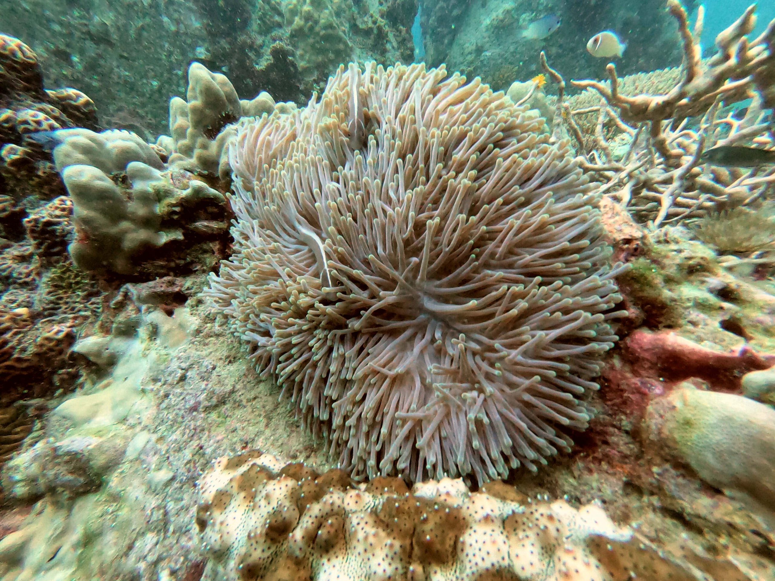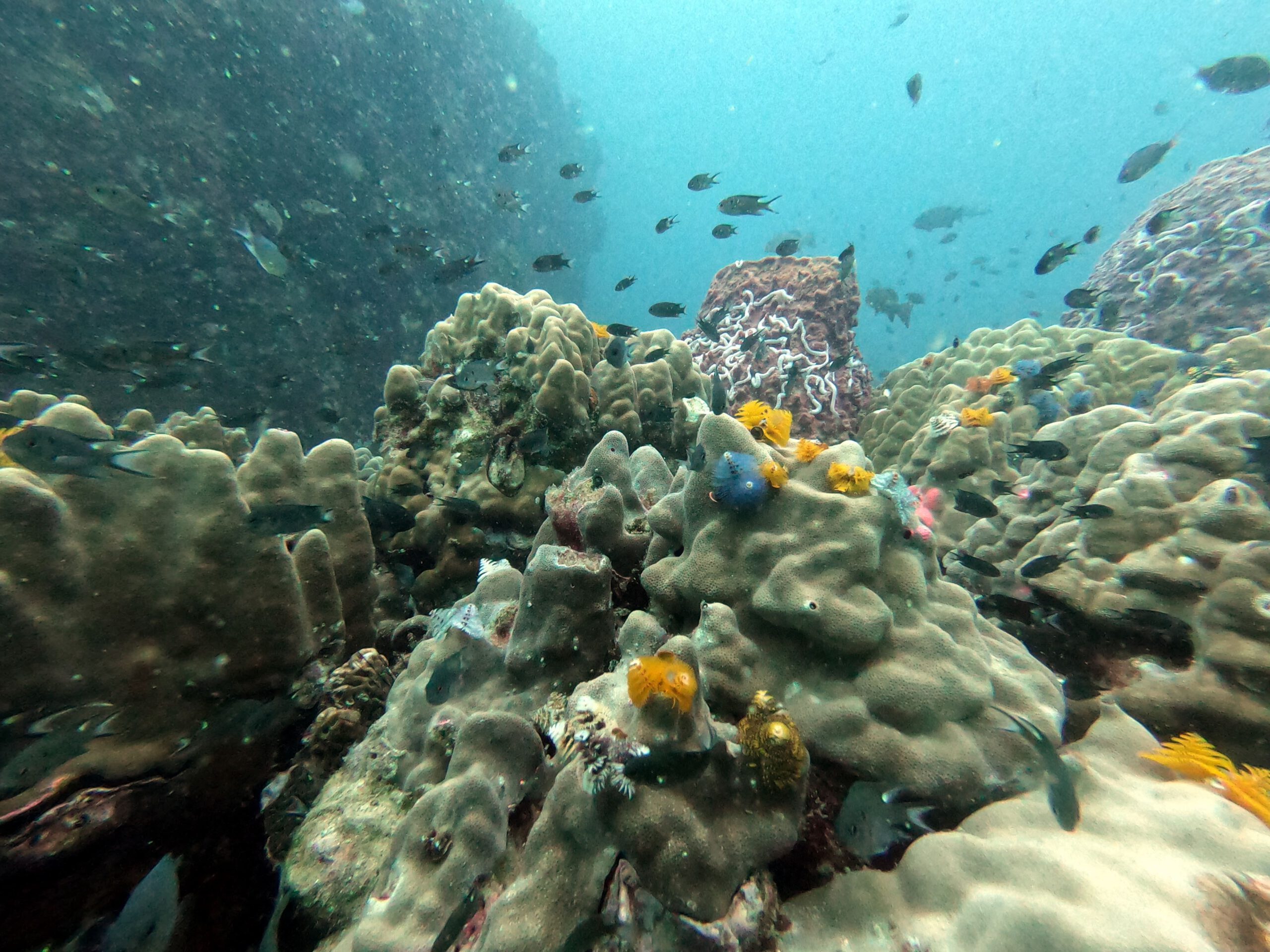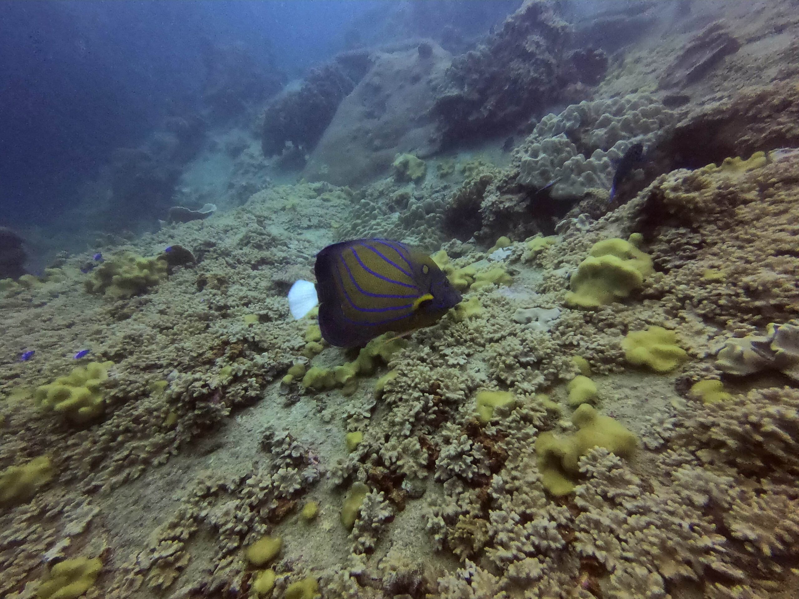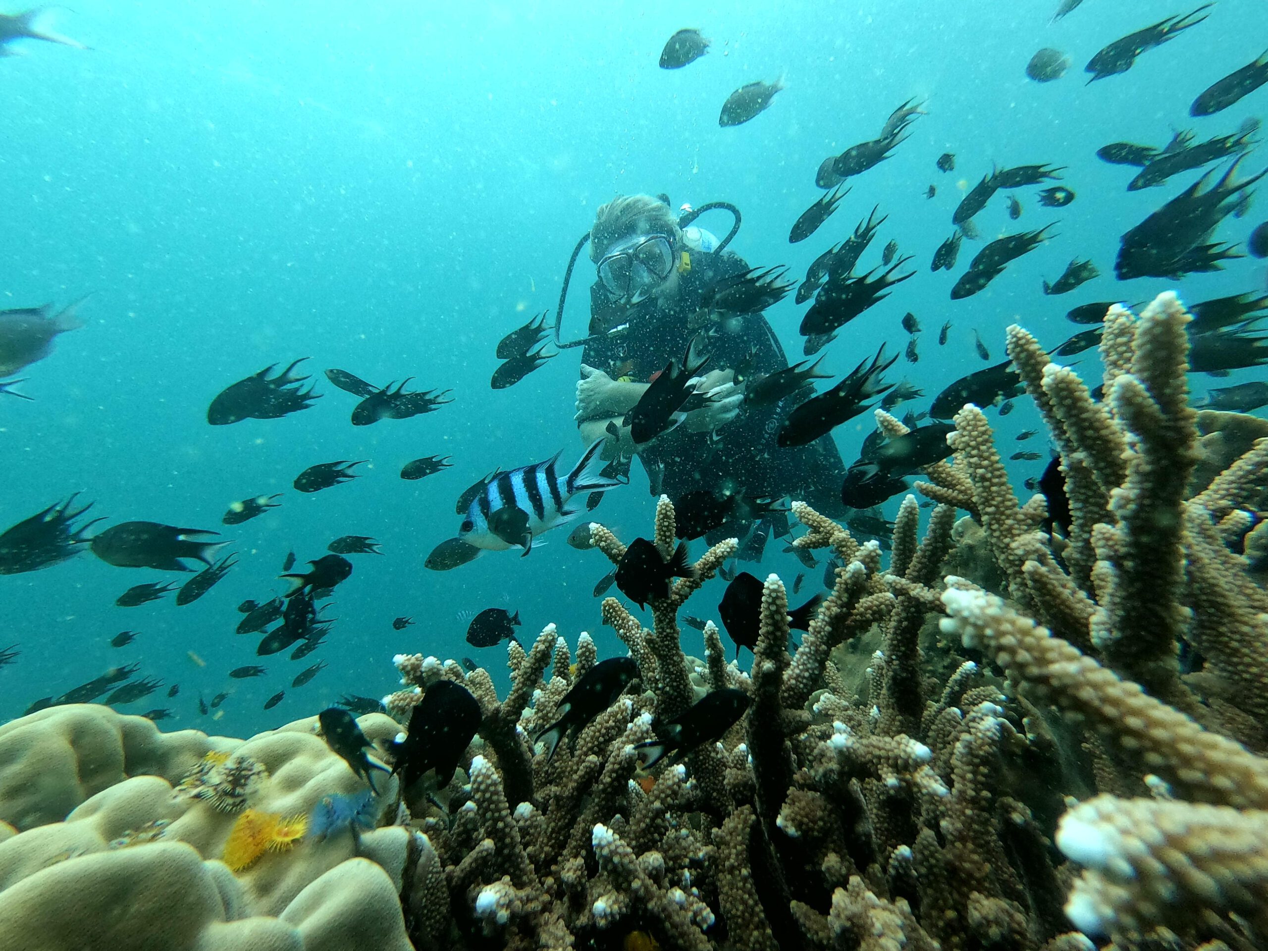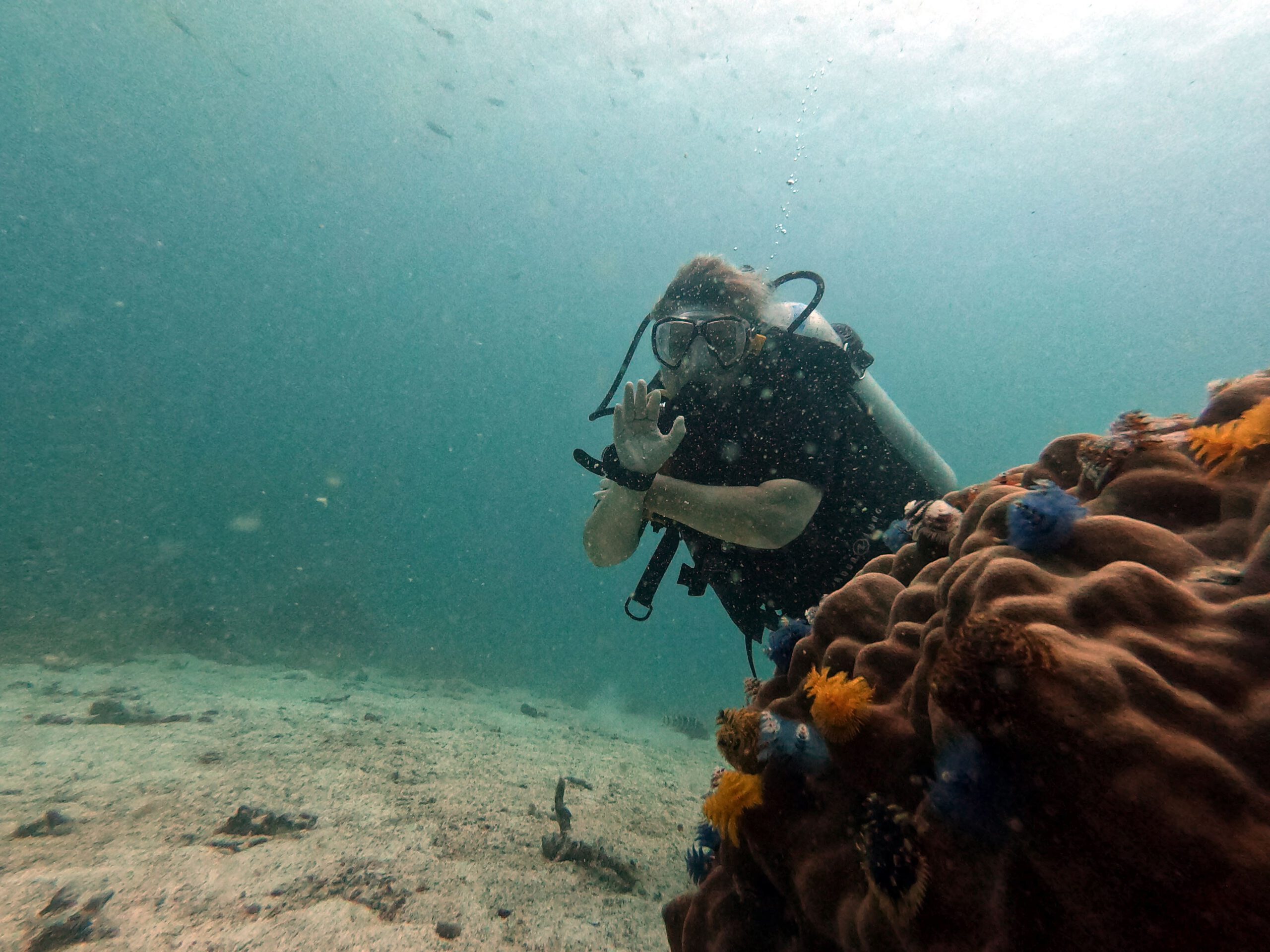 Nach der Ankunft in Koh Tao trennen sich meine Wege und die der Hamburgerinnen. Sie haben einen dreitägigen Anfänger-Tauchkurs gebucht, bei dem die Unterkunft irgendwo auf der Insel gleich mit zum Angebot gehört. Ich nehme mir lieber ein Resort am langen Strand an der Westküste, da wo ich (bzw. wir) schon zweimal waren. Ich hab wirklich ein schönes großes Zimmer und nur 50 m bis zum Strand. Nur leider gibt es keinen Pool – und das ist deshalb blöd, weil man die Füße erst im Bad vom Strandsand befreien kann. Man latscht also immer auf Zehenspitzen (warum macht man das auf Zehenspitzen?🤔) quer durchs Zimmer – nur um abends festzustellen, dass der Sand trotzdem auf unerklärliche Weise 🤷🏻♀️ im Bett gelandet ist! Na prima! Ich lass mir deshalb aber nicht die Lust auf meinen morgendlichen Strandspaziergang zu einem leckeren Café mit vorzüglichem Cappuccino entgehen und lebe mit den Konsequenzen! So😎! Ich habe um die Ecke eine deutsche Tauchbasis gefunden und kann mit Jan (meinem Cottbuser Tauchguide) vier wunderschön relaxte Tauchgänge absolvieren. Er hat eine GoPro dabei und schießt sogar ein paar tolle Fotos. Er erzählt mir auch, dass es vor Corona 75 Tauchschulen bzw. -zentren auf der Insel gegeben hat. Es ist unglaublich sich vorzustellen, wie viele Taucher da hier auf der Insel gewesen sind. Und die alle sind dann an den zahlenmäßig begrenzten Tauchspots ins Wasser gesprungen – Wahnsinn! Jetzt ist es natürlich extrem leer und wir sind fast immer die einzigen beiden ausgebildeten Taucher am Tauchspot (auf dem Boot sind sonst nur noch 2 bis 3 Tauchschüler). Zum Relaxen gehört auch das leckere Essen (natürlich auch der Eierkuchen-Flatsch) und Massagen für 7,50 € pro Stunde. Da die Strände fast überall auf der Insel leer sind, fühlt es sich auch herrlich luxuriös an, weil man quasi einen Privatstrand hat. Allerdings sind auch noch viele Anlagen und Geschäfte zu bzw. völlig zerstört und müssten mal wieder in Schuss gebracht werden. Es sieht an manchen Stellen einfach öde und verlassen aus und das trübt die Urlaubsstimmung ein wenig. Bei unserem letzten Besuch hier, hatten wir einen kleinen Motorradunfall und ich kann mich noch sehr gut erinnern, wie Volker wegen seiner Blessuren pausenlos angequatscht wurde: „accident?“- „Motorbike?“ Auch seine immer kreativeren Antworten wie „climbing“ oder „hiking“ – sind mir in guter Erinnerung🤣. Deshalb war ich ein sehr sehr vorsichtiger Rollerfahrer🛵, als ich auf die andere Seite der Insel gefahren bin. Ich habe mir fest vorgenommen, keine unwegsamen Strecken zu fahren. Deshalb und weil ich mittlerweile auch ein richtiger Schisser bin, bin ich halt bei meiner Inselerkundung auch nur bis zur Sharkbay gekommen. Ich weiß wirklich nicht, warum den Thailändern noch keiner erklärt hat, dass man nicht schnurgerade Straßen auf einen Berg hoch und wieder runter bauen muss – ein paar Serpentinen würden da schon sehr helfen! Aber egal, ich bin die steilen Abschnitte im Schritttempo 🐌 und mit baumelnden Füßen gefahren – wie ein Anfänger 🙈! Safety First! In der Sharkbay war ich dann aber wieder ganz schön dreist und bin erstmal an der teuren Anlage vorbeigefahren und dann von der Seite rein. Dazu musste ich ein klein wenig durchs brusthohe Wasser waten (mit Rucksack auf dem Kopf) und schwupps war ich am wunderschönen Strand. Und als ich einen Pool erspäht habe, nehme ich mir noch rotzfrech eine Liege unterm Sonnenschirm direkt am Pool. Dann war ich prima schnorcheln und konnte den Sand im Pool lassen 😁. So – so eine freche bin ich! Jetzt wisst ihr’s 👀👅!