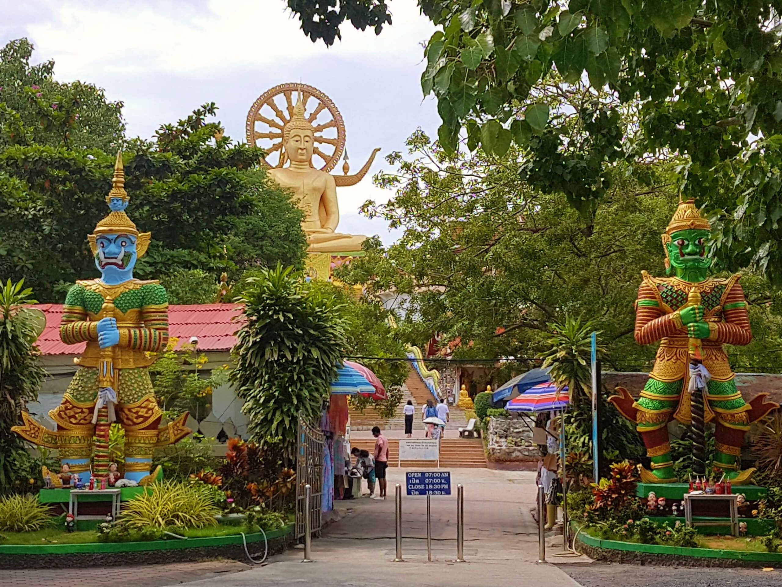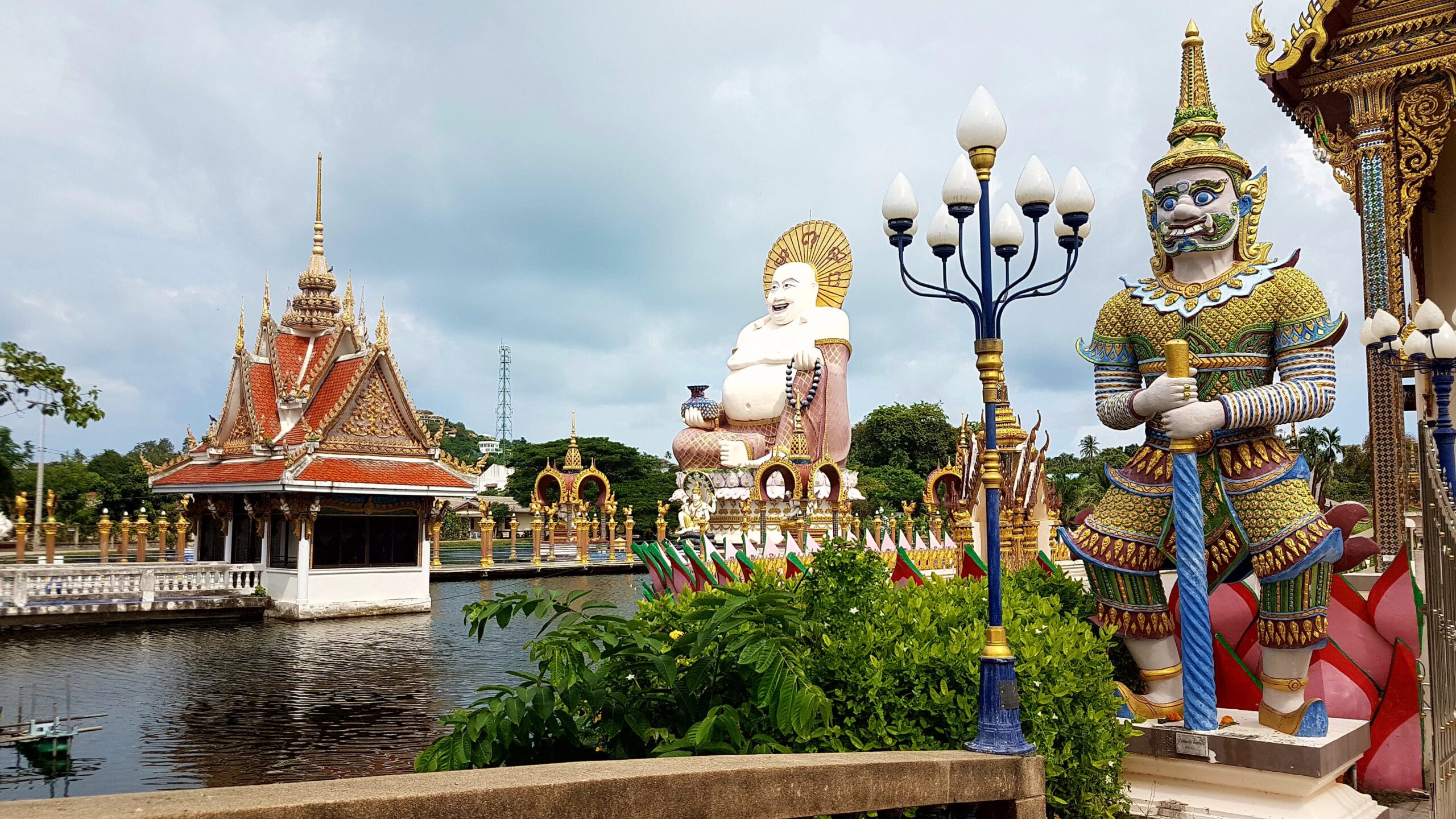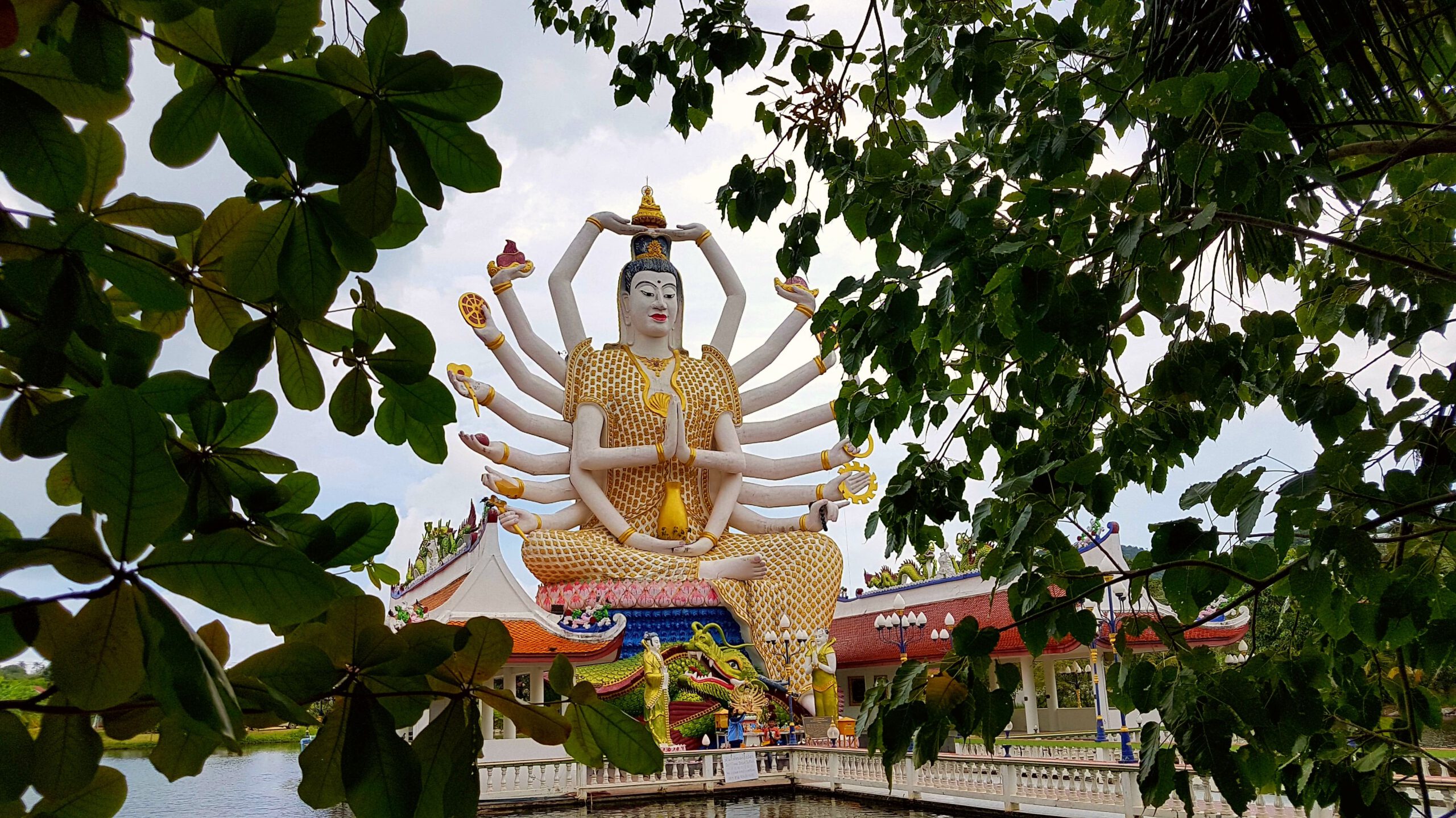 Von Koh Tao aus fahre ich (schon) wieder mit dem Speedboot zurück nach Koh Samui. Diesesmal scheint die Sonne und das Meer ist ruhig. Die Überfahrt ist eigentlich unspektakulär … zumindest bis zu dem Zeitpunkt als sich ein junger Mann neben mich setzt, der in Handschellen gefesselt ist. Auf der Bank gegenüber sitzt ein zweiter, der ebenfalls die Handschellen mit einem Handtuch dürftig bedeckt hat 😨. Oh je – ein mulmiges Gefühl kommt hoch … was einem aber auch immer so passiert🤔? Er ist aber ganz friedlich und beim Aussteigen lässt er mir sogar den Vortritt 🤣. Ich habe ein Hotel in Chaweng gebucht – da steppt sonst der Bär! Das ist ja eigentlich nicht so meins, aber in Anbetracht, dass ich ein paar Leute zum Quatschen treffen will, vielleicht ein riskierbares Übel😉? Aber hier ist so was von tote Hose, alles leergefegt – Wahnsinn! Geschlossene Läden, geschlossene Restaurants – ja sogar das gegenüber liegende Hard Rock Café ist zu – ist denn das zu fassen? Das Hotel ist auch nicht der Brüller, sehr hellhörig und im Nachbarzimmer gibt’s Party. Mir reist der Geduldsfaden und so wackel ich dann nachts um eins zur Rezeption und bitte um ein neues Zimmer (schließlich ist das Hotel ja fast leer). Im zweiten Anlauf klappt das dann auch – es ist in einem anderen Bereich des Hotels – ruhiger und auch etwas größer. Morgens will ich dann zum Frühstück, da bricht der Schlüssel im Schloss ab😨! So – ganz prima gelaufen! Aber in Thailand klappt das immer noch ganz gut, der Monteur kommt binnen Minuten, die Rezeption erklärt mir, dass ich in dem Zimmer bleiben kann und als ich dann feststelle, dass der Safe auch kaputt ist, wird auch der kurzerhand ausgebaut und ersetzt. Da aber immer noch tote Hose ist, miete ich mir einen Roller (das war auch gar nicht so leicht da jemanden zu finden 🛵) und fahre wieder zum Treehouse und buche dort für die nächsten zwei Nächte. Dann folgt noch eine Sightseeingtour zum großen Buddha und zum Plai Leam Tempel mit seiner imposanten Statue von Guan Yin. Sie ist die Göttin der Barmherzigkeit und des Mitgefühls. Außerdem glaubt man, dass sie eine Quelle bedingungsloser Liebe und ein Beschützerin aller Lebewesen ist. Mit ihren 18 Armen soll sie jedem auf der Welt Hilfe anbieten – find ich sehr gut! Mein Umzug ins Treehouse erweist sich als Glücksgriff, ich hab wieder den gleichen Bungalow mit Blick aufs Meer 😊! Als ich dann Koh Samui in Richtung Bangkok verlasse, gießt es wie aus Kübeln🌧! Trennungsschmerz? 🤣🤣