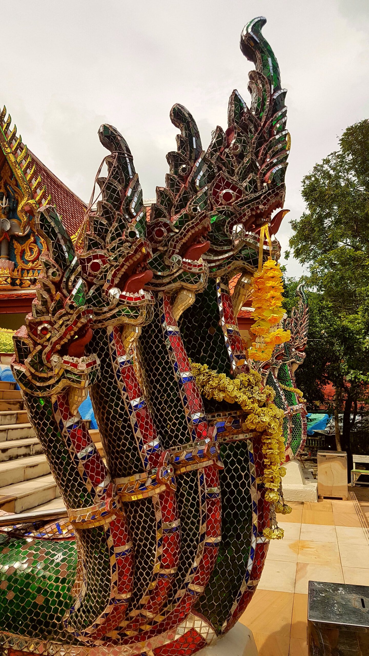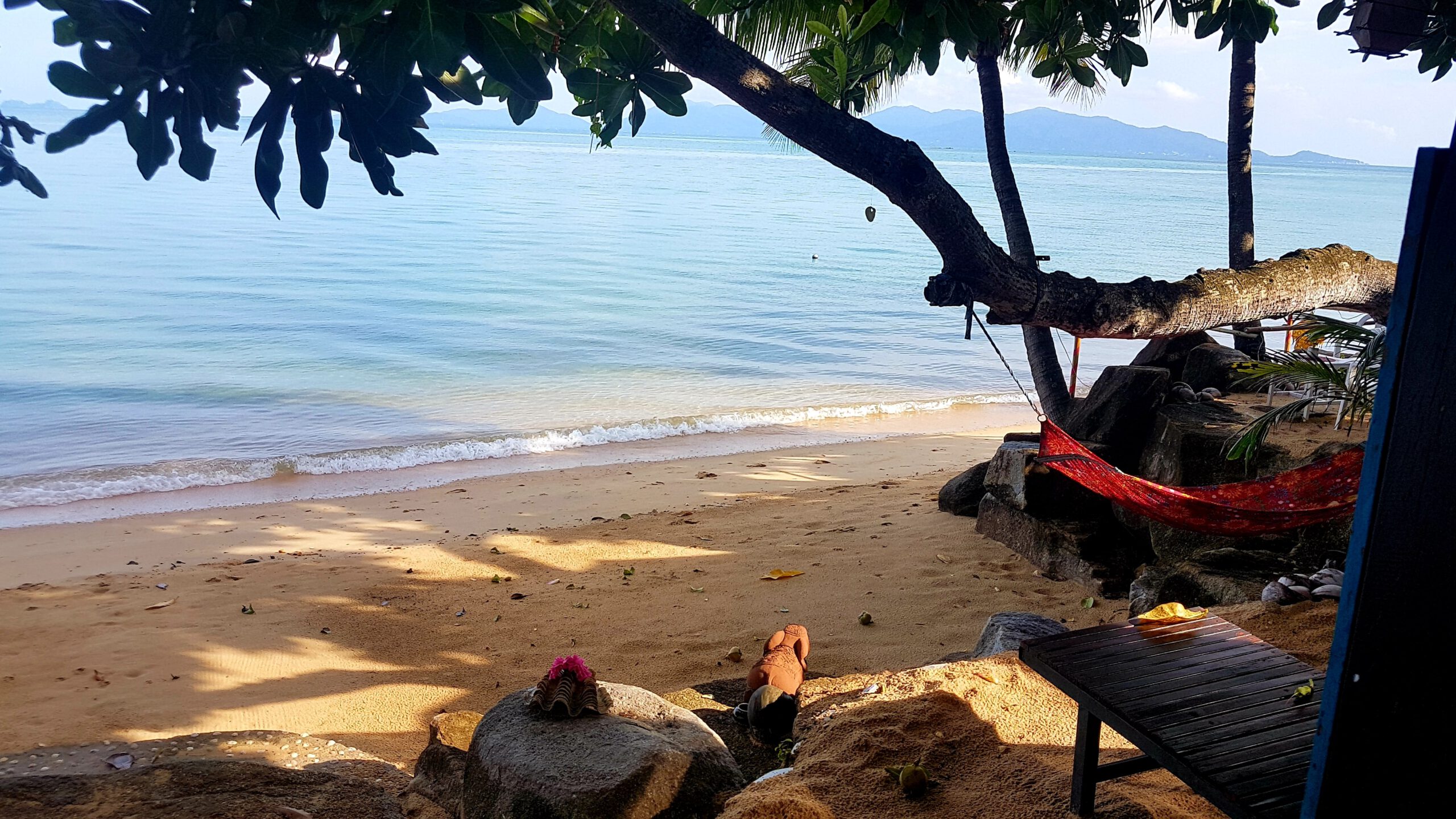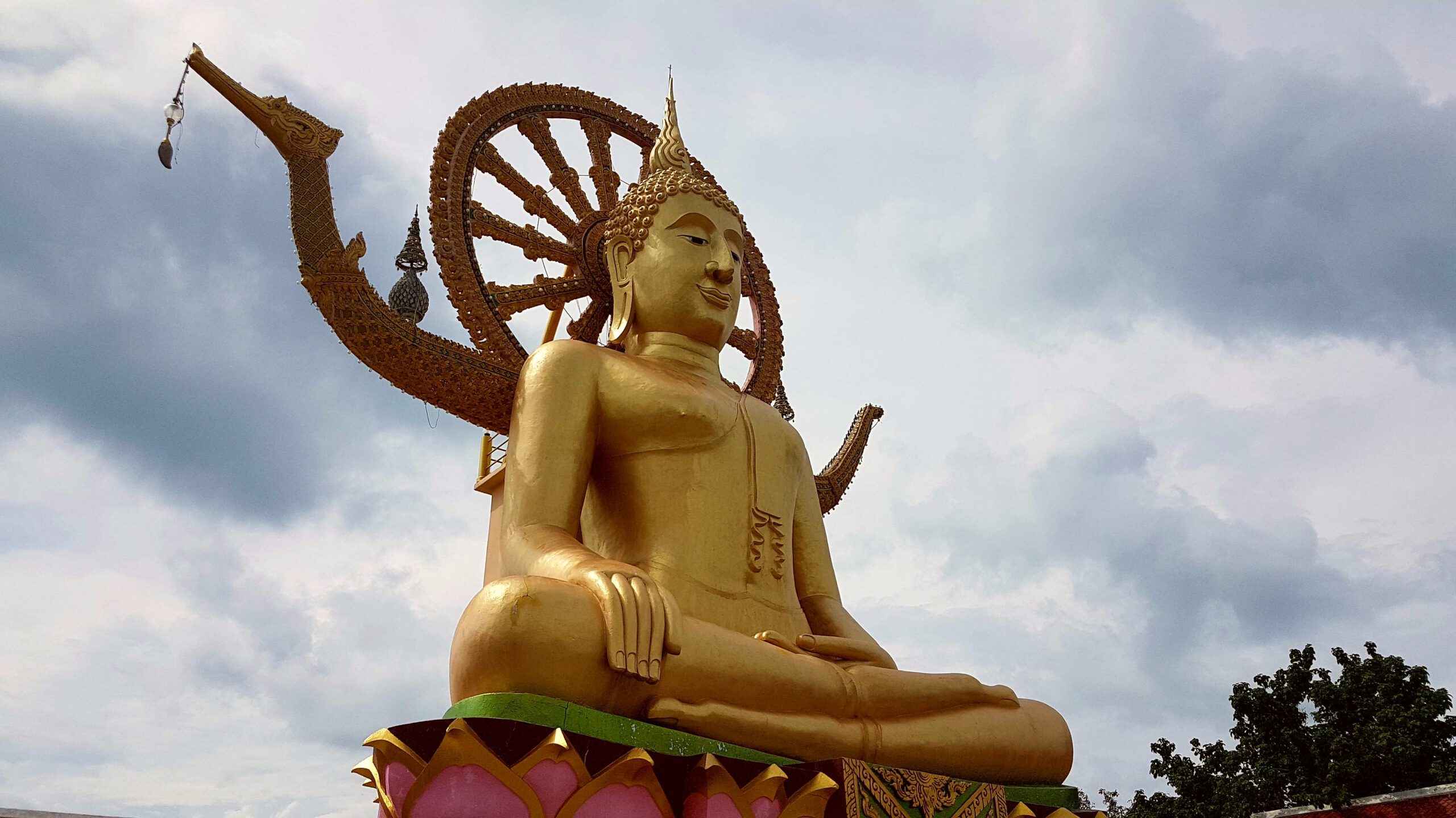 Von Koh Tao aus fahre ich (schon) wieder mit dem Speedboot zurück nach Koh Samui. Diesesmal scheint die Sonne und das Meer ist ruhig. Die Überfahrt ist eigentlich unspektakulär … zumindest bis zu dem Zeitpunkt als sich ein junger Mann neben mich setzt, der in Handschellen gefesselt ist. Auf der Bank gegenüber sitzt ein zweiter, der ebenfalls die Handschellen mit einem Handtuch dürftig bedeckt hat 😨. Oh je – ein mulmiges Gefühl kommt hoch … was einem aber auch immer so passiert🤔? Er ist aber ganz friedlich und beim Aussteigen lässt er mir sogar den Vortritt 🤣. Ich habe ein Hotel in Chaweng gebucht – da steppt sonst der Bär! Das ist ja eigentlich nicht so meins, aber in Anbetracht, dass ich ein paar Leute zum Quatschen treffen will, vielleicht ein riskierbares Übel😉? Aber hier ist so was von tote Hose, alles leergefegt – Wahnsinn! Geschlossene Läden, geschlossene Restaurants – ja sogar das gegenüber liegende Hard Rock Café ist zu – ist denn das zu fassen? Das Hotel ist auch nicht der Brüller, sehr hellhörig und im Nachbarzimmer gibt’s Party. Mir reist der Geduldsfaden und so wackel ich dann nachts um eins zur Rezeption und bitte um ein neues Zimmer (schließlich ist das Hotel ja fast leer). Im zweiten Anlauf klappt das dann auch – es ist in einem anderen Bereich des Hotels – ruhiger und auch etwas größer. Morgens will ich dann zum Frühstück, da bricht der Schlüssel im Schloss ab😨! So – ganz prima gelaufen! Aber in Thailand klappt das immer noch ganz gut, der Monteur kommt binnen Minuten, die Rezeption erklärt mir, dass ich in dem Zimmer bleiben kann und als ich dann feststelle, dass der Safe auch kaputt ist, wird auch der kurzerhand ausgebaut und ersetzt. Da aber immer noch tote Hose ist, miete ich mir einen Roller (das war auch gar nicht so leicht da jemanden zu finden 🛵) und fahre wieder zum Treehouse und buche dort für die nächsten zwei Nächte. Dann folgt noch eine Sightseeingtour zum großen Buddha und zum Plai Leam Tempel mit seiner imposanten Statue von Guan Yin. Sie ist die Göttin der Barmherzigkeit und des Mitgefühls. Außerdem glaubt man, dass sie eine Quelle bedingungsloser Liebe und ein Beschützerin aller Lebewesen ist. Mit ihren 18 Armen soll sie jedem auf der Welt Hilfe anbieten – find ich sehr gut! Mein Umzug ins Treehouse erweist sich als Glücksgriff, ich hab wieder den gleichen Bungalow mit Blick aufs Meer 😊! Als ich dann Koh Samui in Richtung Bangkok verlasse, gießt es wie aus Kübeln🌧! Trennungsschmerz? 🤣🤣