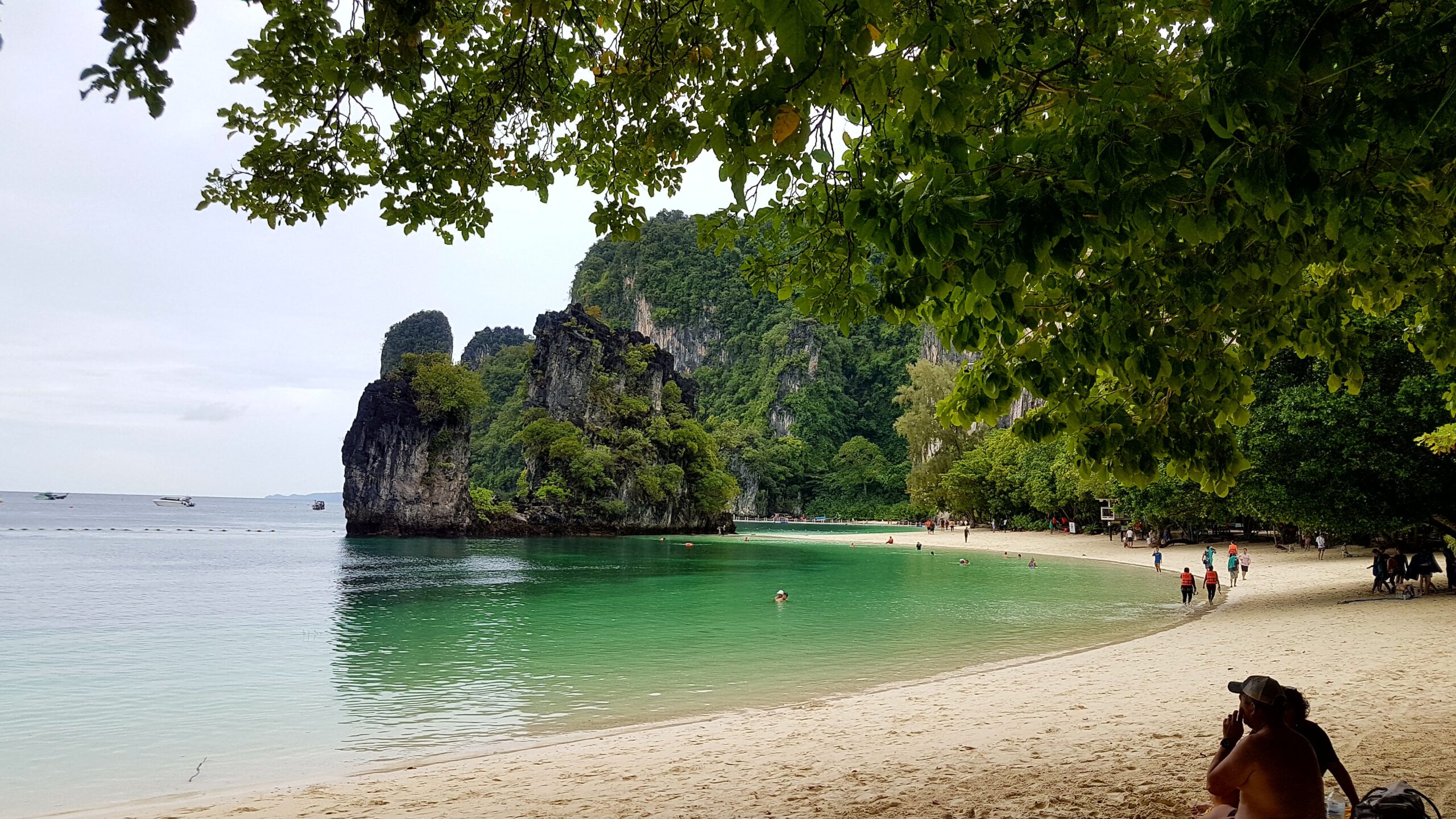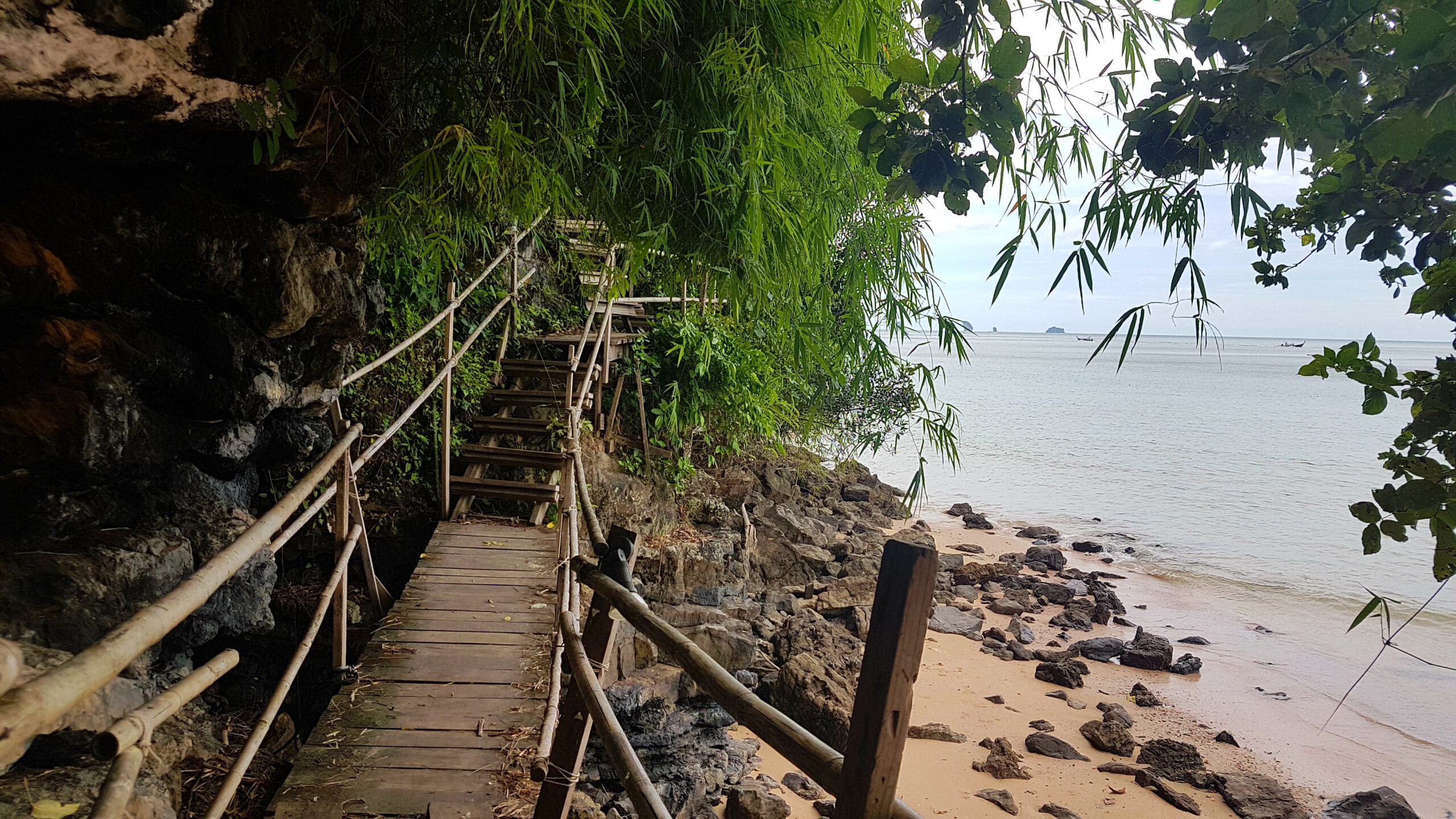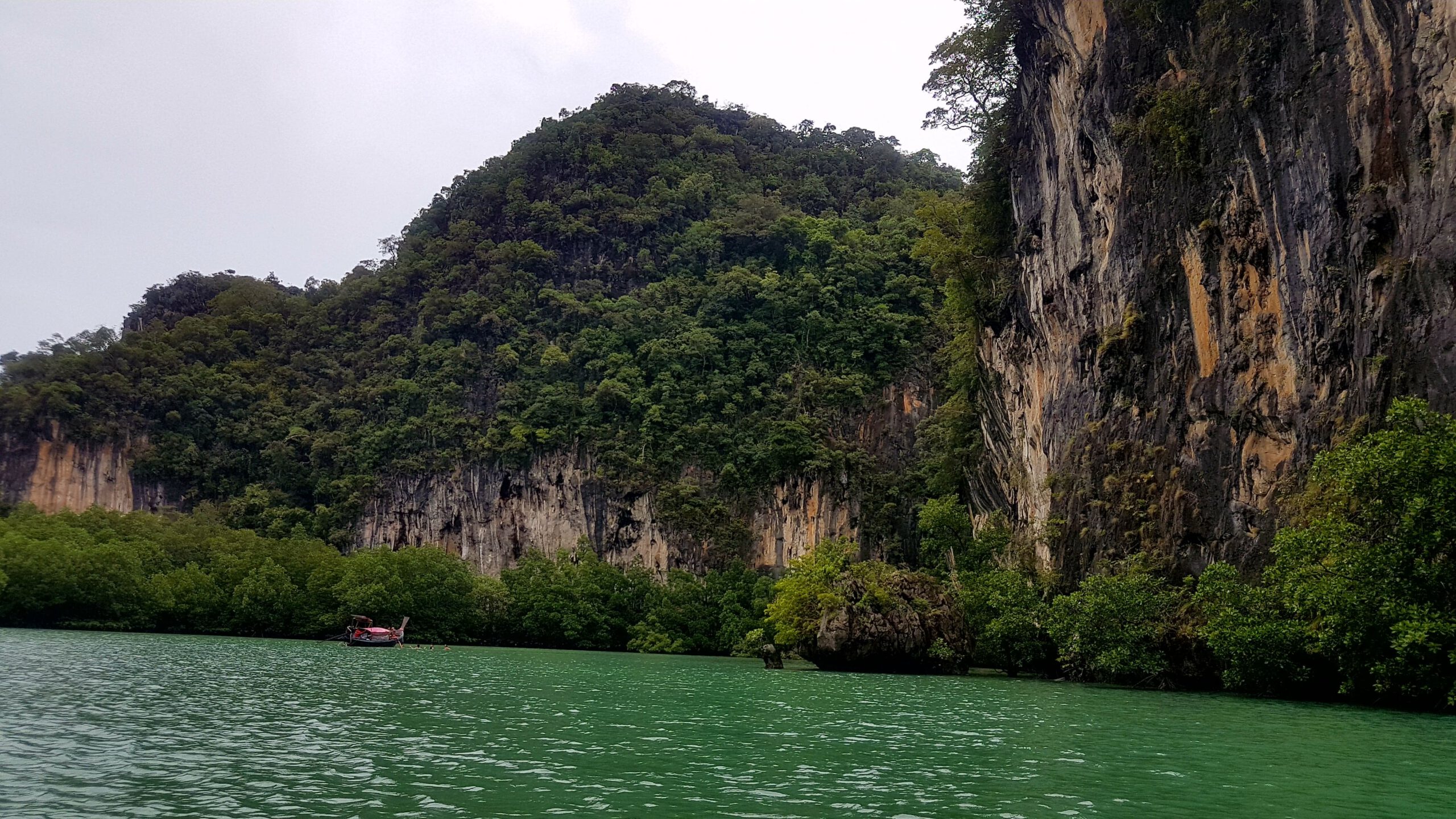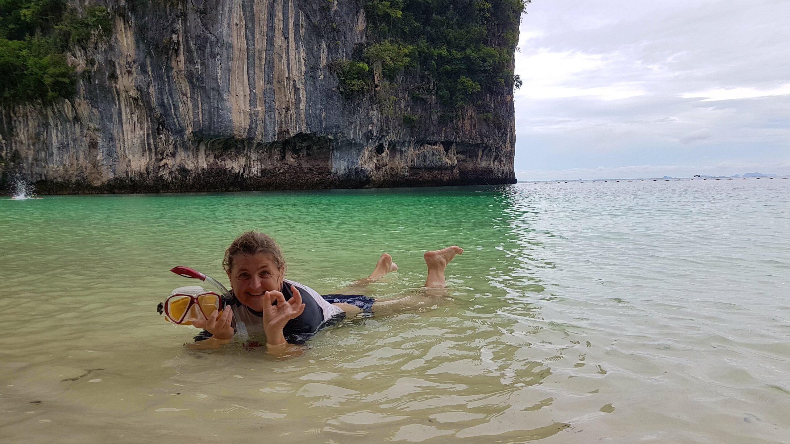 Nach den ganzen vielen Tempeln, Ruinen und Buddhas muss es jetzt mal wieder ein wenig Meer sein! Simone und Jörg verbringen ein paar Tage in Chiang Mai und ich fliege nach Krabi im südlichen Thailand zum Entspannen am Meer. Leider ist das Wetter nicht mehr sooo toll 🙊- was beklag ich mich denn? Es ist warm und meistens teils auch trocken nur die Sonne fehlt, weil es oft bedeckt ist. Das ist einerseits gut, weil man sich nicht verbrennt (schließlich hab ich ja keinen mit, der mir den Rücken eincremt 😔) aber anderseits, werden die Fotos mit Sonne einfach schöner 😣! Das hält mich aber nicht davon ab, auch hier ein paar Unternehmungen zu machen. Als erstes würde ich gern mit dem Boot nach Railay-Beach fahren – da hat es mir richtig gut gefallen! Jetzt ist es allerdings ein wenig anders als 🤔, ja wann war ich denn schon mal hier ? 2007 oder so? Naja egal- es ist schon eine ganze Weile her! Aktuell ist es jedenfalls so, dass ich nur eine Bootsfahrt kaufen kann, wenn mit mir noch weitere 7 Leute dahin wollen. Dann kostet die Fahrt 100 Baht (also 2,50 €). Wenn ich alleine fahren will, muss ich 800 Baht (also 20 €) bezahlen – aha😣! Aber die Dame vom Tourenschalter beruhigt mich und meinte, ich sei Nr. 7 – es fehlt also nur noch einer! Der kommt auch bald und so kann’s losgehen. Der Strand ist immer noch sehr schön, und das Wasser ist herrlich warm. Nur das Liegen im Sand ist auf die Dauer nichts mehr für meine alten Knochen. Die verfügbaren Liegen gehören ausschließlich den Hotelgästen und so wandere ich etwas umher, komme an der Abzweigung zum Viewpunkt vorbei und muss unweigerlich daran denken, wie wir dort hoch gekraxelt sind und bei strömendem Regen völlig verdreckt, aber gottseidank trotz glitschigem Weg und Seil, heil wieder runter! Das war ein einmaliges Abenteuer und wird auf keinen Fall wiederholt! Für Volker schieß ich ein Erinnerungsfoto! Dann hau ich mich nochmal in den Sand an diesem denkwürdigen Strand und nach ca. 2 h habe ich keine Lust mehr und würde gern zurück fahren. Nur jetzt brauch ich schon wieder 8 Leute! Es ist eher abtörnend, weil es noch weitere 2 h dauert, bis diese 8 Leute zusammen sind! Alle Versuche, die weiterhin ankommenden Boote zu überreden, mich mit zurück zunehmen, scheitern – sie fahren lieber leer zurück als den Preis zu senken – und mein Frustlevel steigt! Das ist meine erste und letzte Fahrt an diesen Strand! Am nächsten Tag wandere ich über den Monkey-Trail (nur ca. 20 Min) zum Pai Plong Beach. Ein toller Strand- rotzfrech lege ich mich auf eine Liege (die schon wieder zu einem Hotel gehört, aber mich vertreibt hier keiner) und leiste mir noch einen tollen Eisbecher! Auf dem Rückweg kommt tatsächlich auf dem Monkey-Trail eine Horde Affen vorbei und ich hole schnell mein Handy aus dem Rucksack. Leider versäume ich in der Hektik den Reißverschluss komplett zu schließen und das sieht einer der Affen und springt mir an den Rucksack und öffnet ihn rotzfrech. Ich schreie ihn an und er zeigt mir seine Zähne und trollt sich mit der rausgefallenen Wasserflasche! So ein Schlingel🐒! Ich erkunde bei einer Boots- und Schnorcheltour am nächsten Tag die herrliche Inselwelt der Umgebung. Leider wettertechnisch schon wieder suboptimal, aber das lässt sich halt nicht ändern. Bei schönem Wetter wäre das hier geradezu paradiesisch- so ist es eben einfach nur schön 😊🙃!